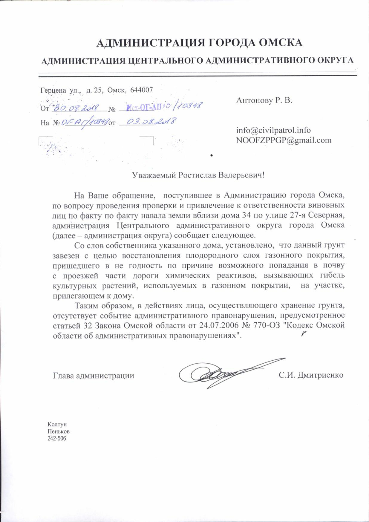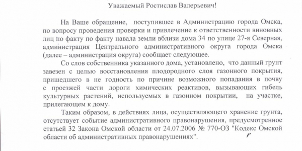 Номер жалобы:39434 Тип жалобы:Прочее Название объекта:Мэрия Регион:Омская область Город:Омск Адрес:ул. 27-я Северная, 34 Описание жалобы:Сгребли землю и бросили Статус: