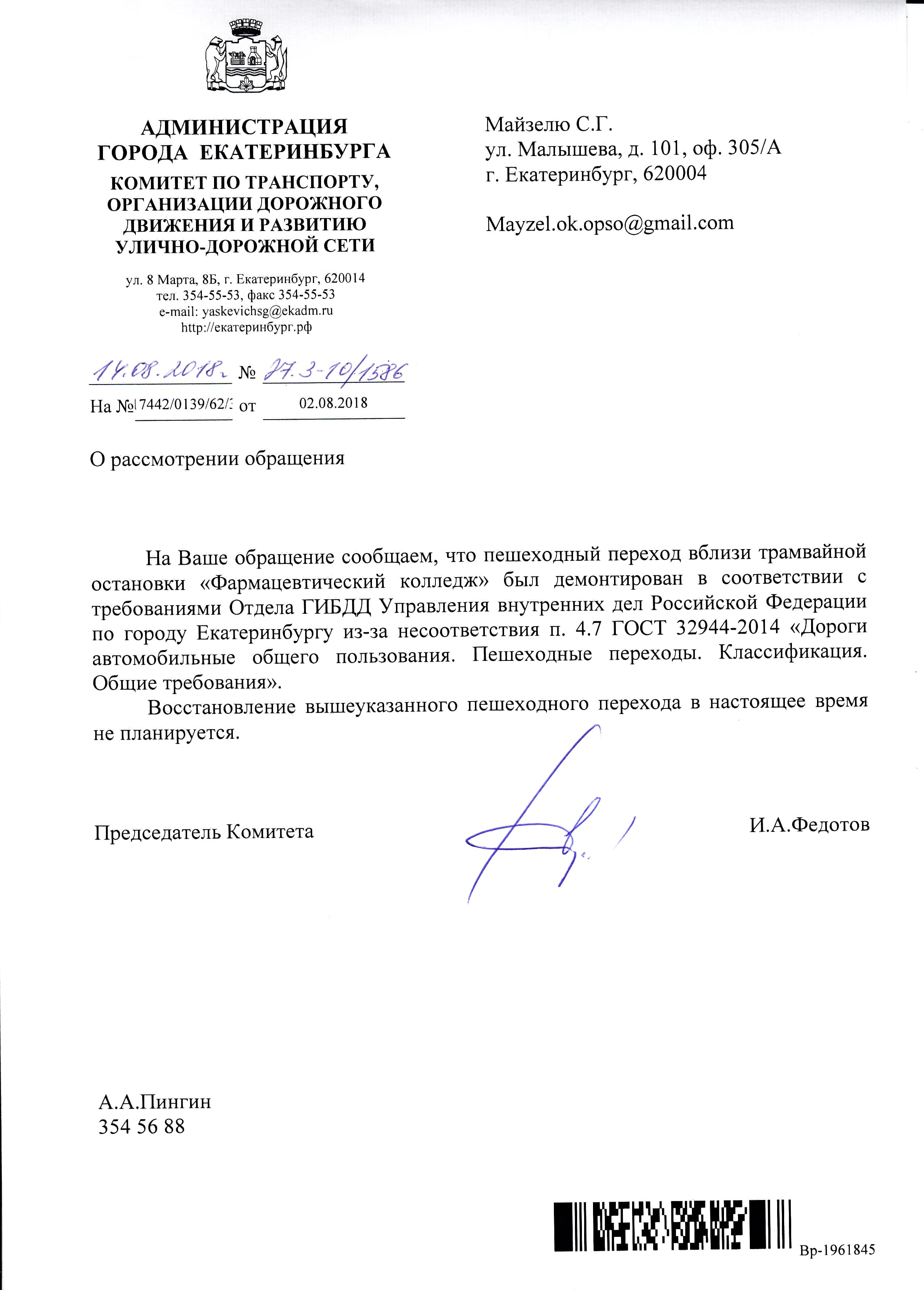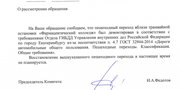 Номер жалобы:39470 Тип жалобы:Прочее Название объекта:Администрация Екатеринбурга Регион:Свердловская область Город:Екатеринбург Адрес:улица Халтурина Описание жалобы:Необходимо восстановление пешеходного перехода у трамвайной остановки «Фармацевтический колледж». Статус:
