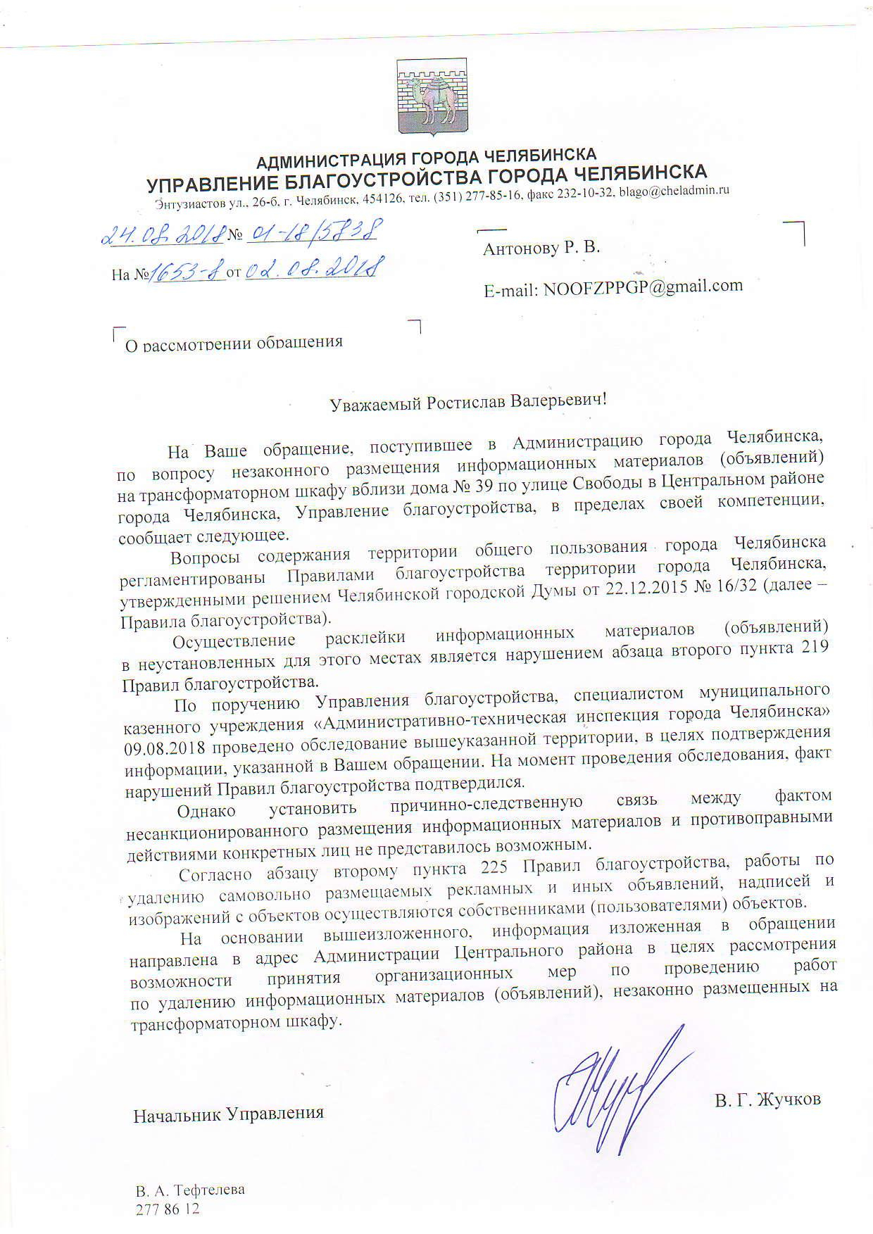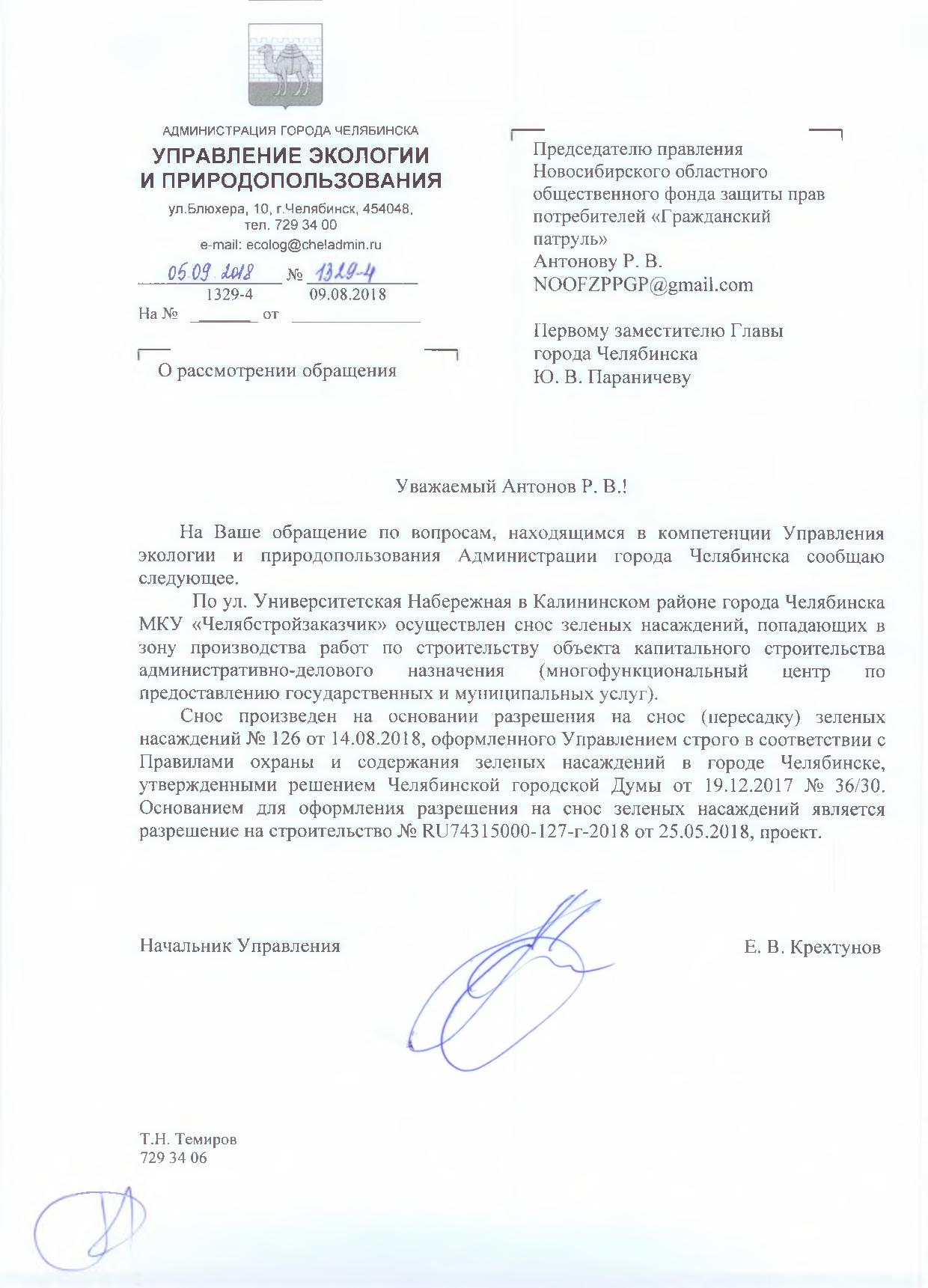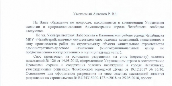 Номер жалобы:39483 Тип жалобы:Прочее Название объекта:Администрация Калининского Района Города Челябинска Город:Челябинск Адрес:Челябинск, улица Университетская Набережная, 80 Описание жалобы:При возведении временной дороги для строительства объекта были уничтожены 3 дерева, прошу проверить наличие разрешения на уничтожение деревьев Статус: