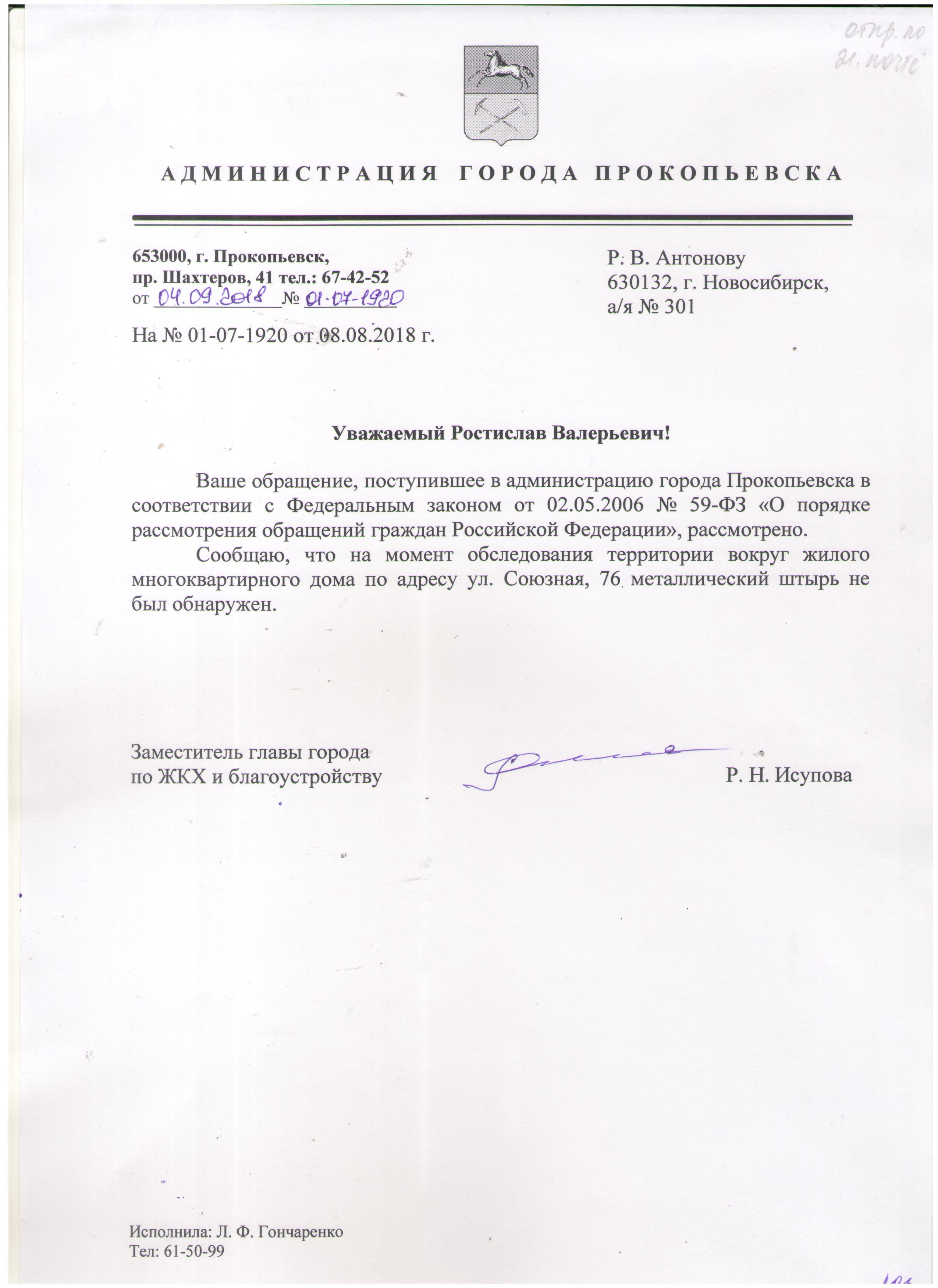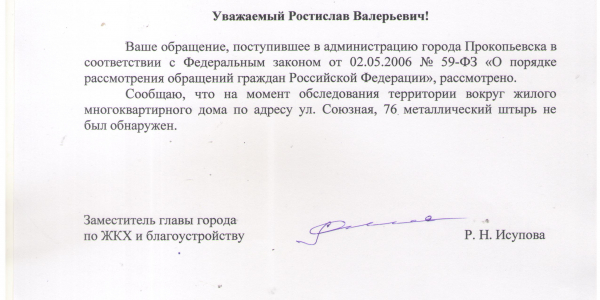 Номер жалобы:39506 Тип жалобы:Прочее Название объекта:8 Регион:Кемеровская область Город:Прокопьевск Адрес:ул. Союзная, 76 Описание жалобы:Металлический штырь с торца дома Статус: