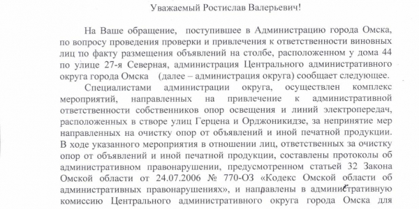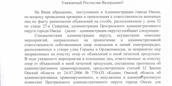 Номер жалобы:39426 Тип жалобы:Прочее Название объекта:Мэрия Регион:Омская область Город:Омск Адрес:ул. 27-я Северная, 44 Описание жалобы:На столбе размещена реклама, прикручена на два огромных болта Статус: