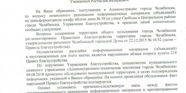 Номер жалобы:39477 Тип жалобы:Прочее Название объекта:Незнаю Регион:Челябинская область Город:Челябинск Адрес:ул. Свободы, 39 Описание жалобы:Размещение рекламы в неположенном месте. Статус: