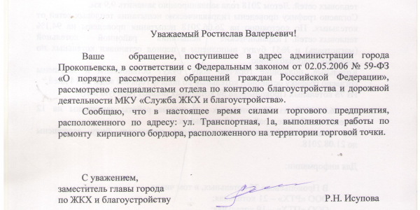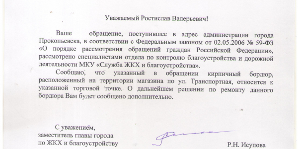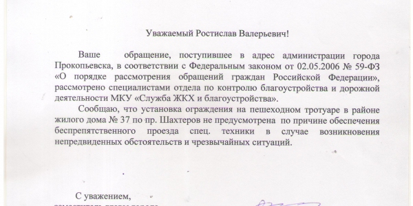 Номер жалобы:39507 Тип жалобы:Прочее Название объекта:8 Регион:Кемеровская область Город:Прокопьевск Адрес:Транспортная ул., 1 Описание жалобы:Повторная жалоба. Разрушенный забор, в предыдущей жалобе сообщили что забор не обнаружен. Может называется кирпичным бордюром. Рядом с аптекой Статус: