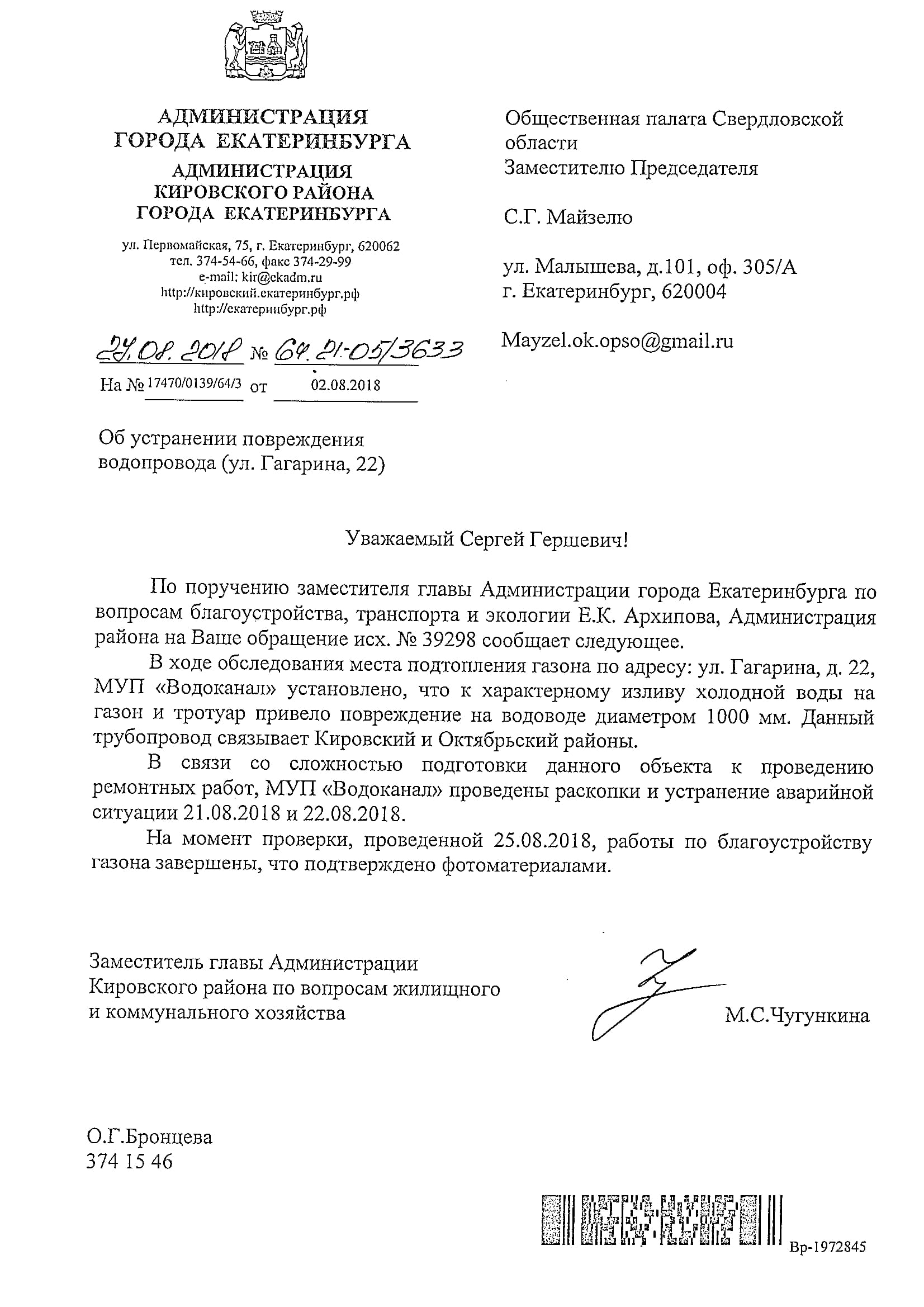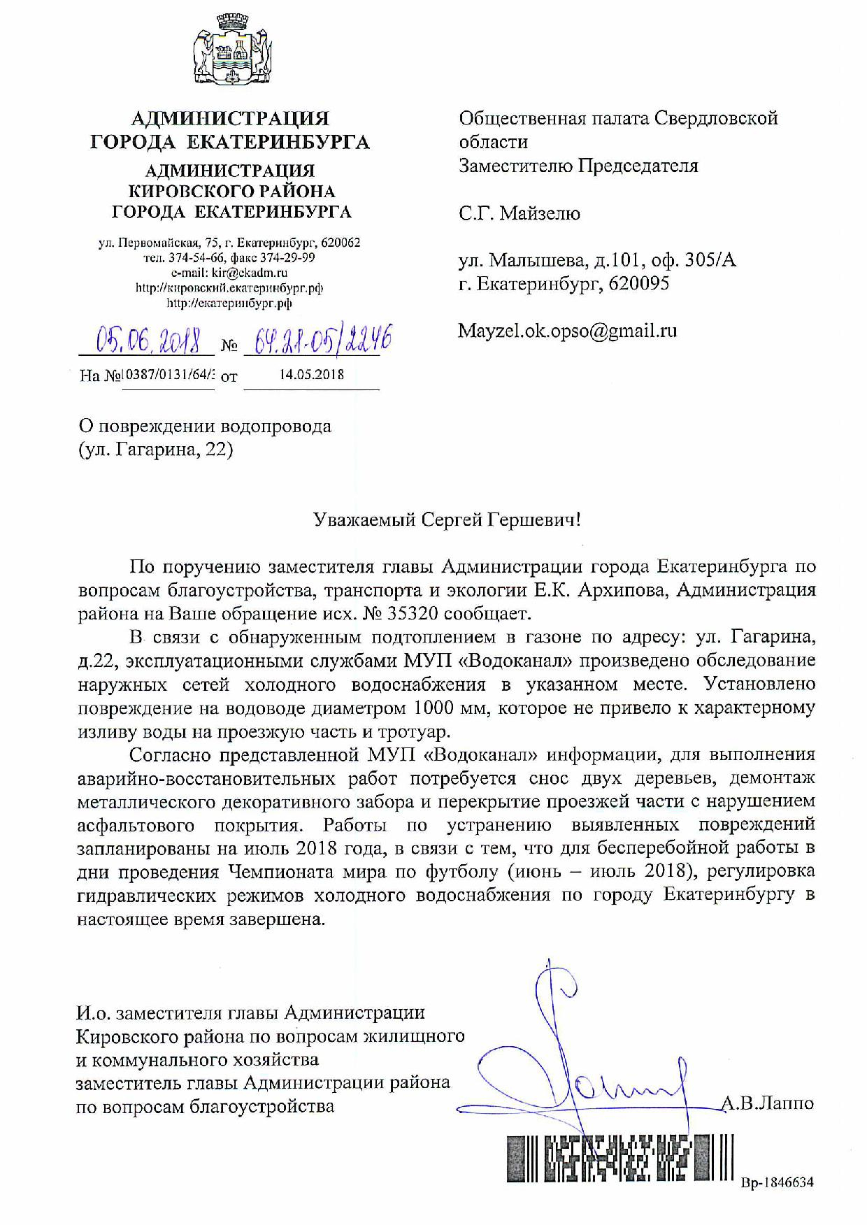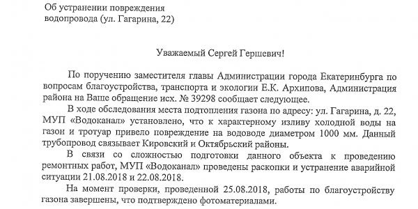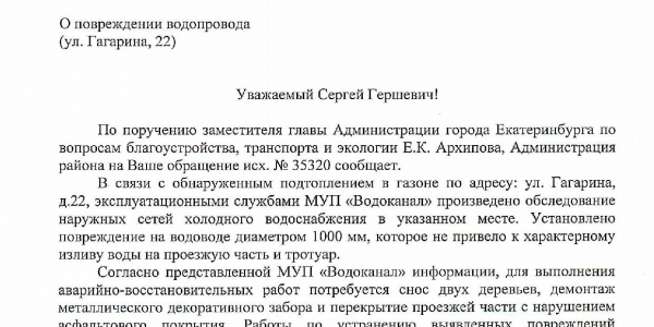 Номер жалобы:39298 Тип жалобы:Прочее Название объекта:МУП Водоканал Регион:Свердловская область Город:Екатеринбург Адрес:улица Гагарина, 22 Описание жалобы:Повреждение водовода диаметром 1000 мм, вызвавшее подтопление газона. В ответе на жалобу 35320 сообщается, что работы по устранению повреждения запланированы на июль 2018 года. Однако на 31 июля 2018 года работы не начаты. Статус:
