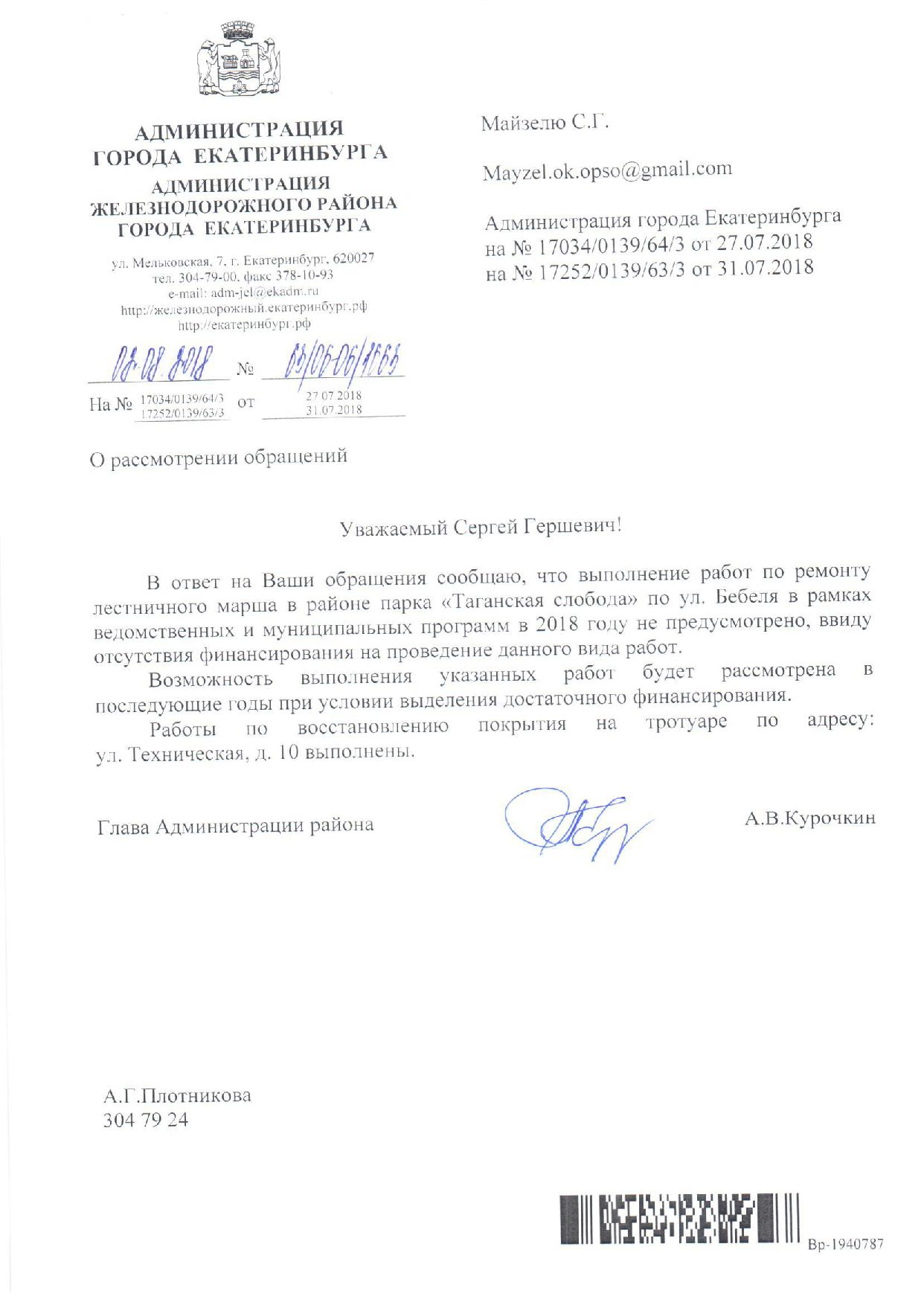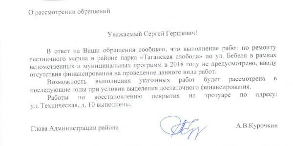 Номер жалобы:39327 Тип жалобы:Прочее Название объекта: Регион:Свердловская область Город:Екатеринбург Адрес:(56.865271, 60.548636) Описание жалобы:На входе в Таганский парк со стороны ул. Бебеля разрушена лестница Статус: