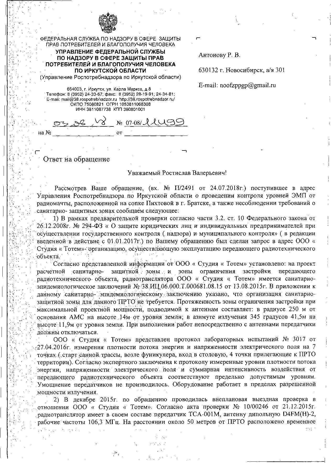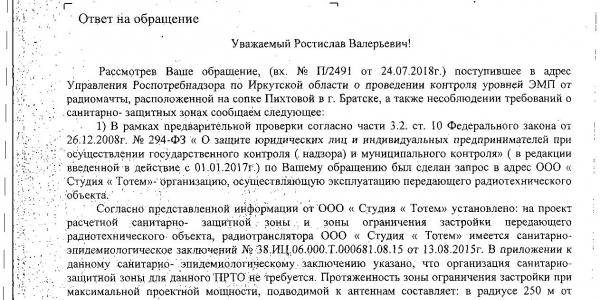 Номер жалобы:39091 Тип жалобы:Прочее Название объекта:Ростех Регион:Иркутская область Город:Братск Адрес:Unnamed Road, Описание жалобы:По адресу: г. Братск, Иркутская область, (кадастровый номер земельного участка: 38:34:010601:0009) на стартовой площадке санной трассы горнолыжного комплекса «Гора Пихтовая» расположена радиомачта, на которой находится большое количество радиопередающего оборудования. Местность адаптирована под детские секции, стоят спортивные сооружения, кафе. НЕ СОБЛЮДЕНЫ требования СанПиН 2.1.8/2.2.4.1190-03 в плане оборудования Санитарной Защитной Зоны, не проведён контроль уровней ЭМП (электромагнитных полей). Нарушение правовых актов, устанавливающих санитарно-эпидемиологические требования (в том числе критерии безопасности и безвредности факторов среды обитания для человека, гигиенические и иные нормативы) создают серьёзную угрозу здоровью отдыхающих на горнолыжном комплексе и спортсменов. Статус: