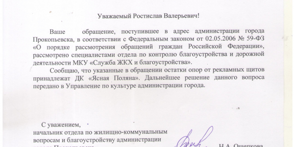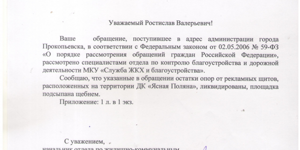 Номер жалобы:39024 Тип жалобы:Прочее Название объекта:7 Регион:Кемеровская область Город:Прокопьевск Адрес:улица Кучина, 9 Описание жалобы:Остатки опор от рекламных щитов Статус: