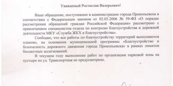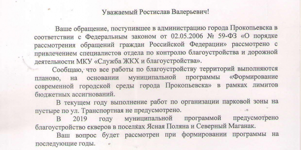 Номер жалобы:39042 Тип жалобы:Прочее Название объекта:7 Регион:Кемеровская область Город:Прокопьевск Адрес:Транспортная улица Описание жалобы:Запросить возможность организации парковой зоны на данном пустыре. Статус: