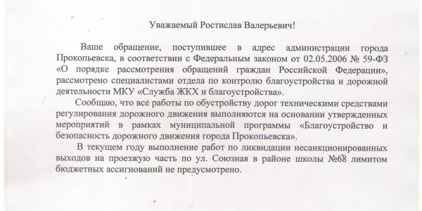 Номер жалобы:39043 Тип жалобы:Прочее Название объекта:7 Регион:Кемеровская область Город:Прокопьевск Адрес:Союзная улица Описание жалобы:Ликвидировать небезопасные переходы с пришкольной территории на проезжую часть. В 5-10 метрах от них находится пешеходный переход Статус: