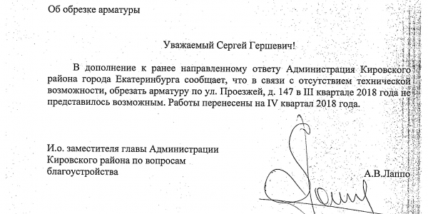 Номер жалобы:39157 Тип жалобы:Прочее Название объекта:Администрация Екатеринбурга Регион:Свердловская область Город:Екатеринбург Адрес:Проезжая улица, 147 Описание жалобы:В 1 м к югу от въезда во двор дома 147 по улице Проезжей на стыке тротуара и газона торчит обрезок арматуры. Статус: