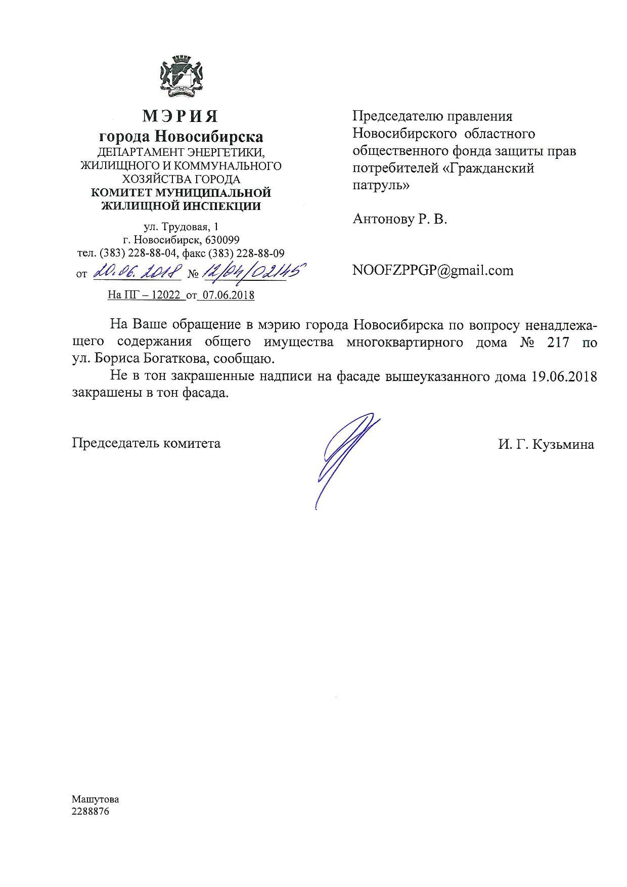 Номер жалобы:35857 Тип жалобы:Иные проблемы ЖКХ Название объекта:Управляющая Компания Регион:Новосибирская область Город:Новосибирск Адрес:ул. Бориса Богаткова, 215 Описание жалобы:Надписи на фасаде хозяйственного корпуса Статус: