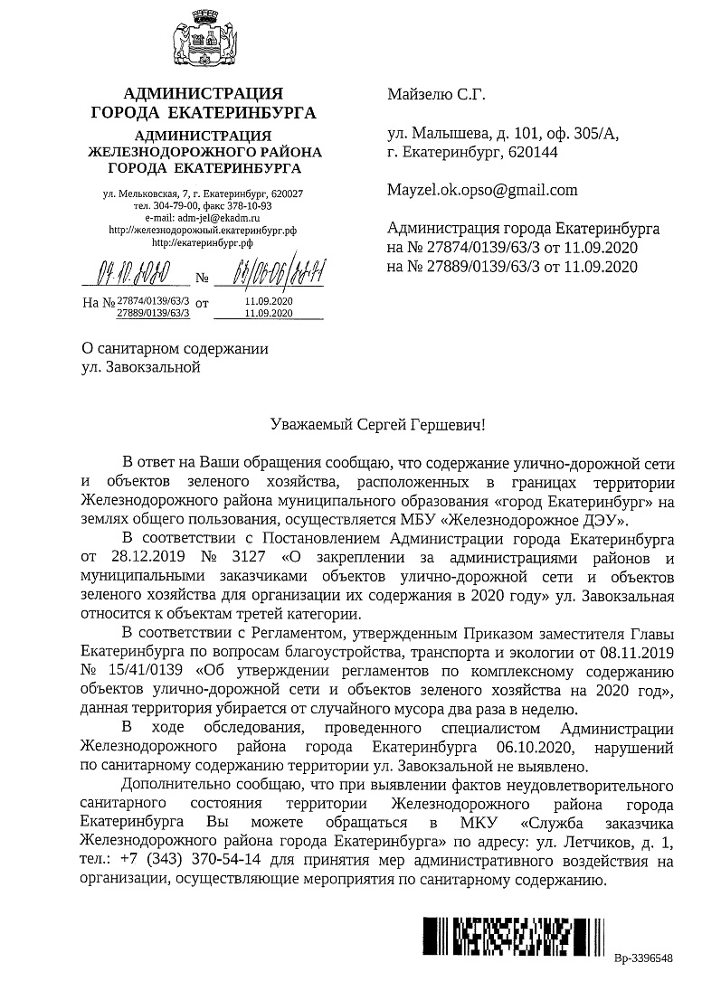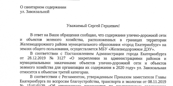 Номер жалобы:68986 Тип жалобы:Прочее Название объекта:мэрия Регион:Свердловская область Город:Екатеринбург Адрес:Завокзальная улица, 13 Описание жалобы:Отсутствует уборка мусора в проходе между домами № 13 и № 15А по улице Завокзальной. Статус: