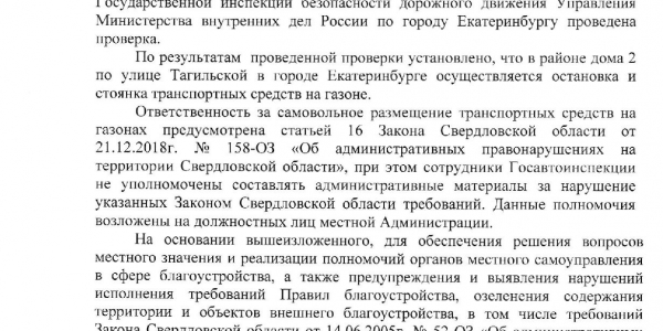 Номер жалобы:68995 Тип жалобы:Прочее Название объекта:мэрия Регион:Свердловская область Город:Екатеринбург Адрес:Тагильская улица, 2 Описание жалобы:Парковка на газоне Статус: