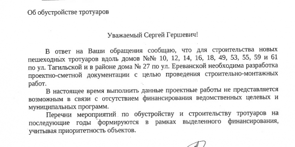 Номер жалобы:68998 Тип жалобы:Прочее Название объекта:мэрия Регион:Свердловская область Город:Екатеринбург Адрес:Тагильская улица, 19, 23 Описание жалобы:Необходима обрезка веток, сужающих ширину тротуара и нависающих над ним. Статус: