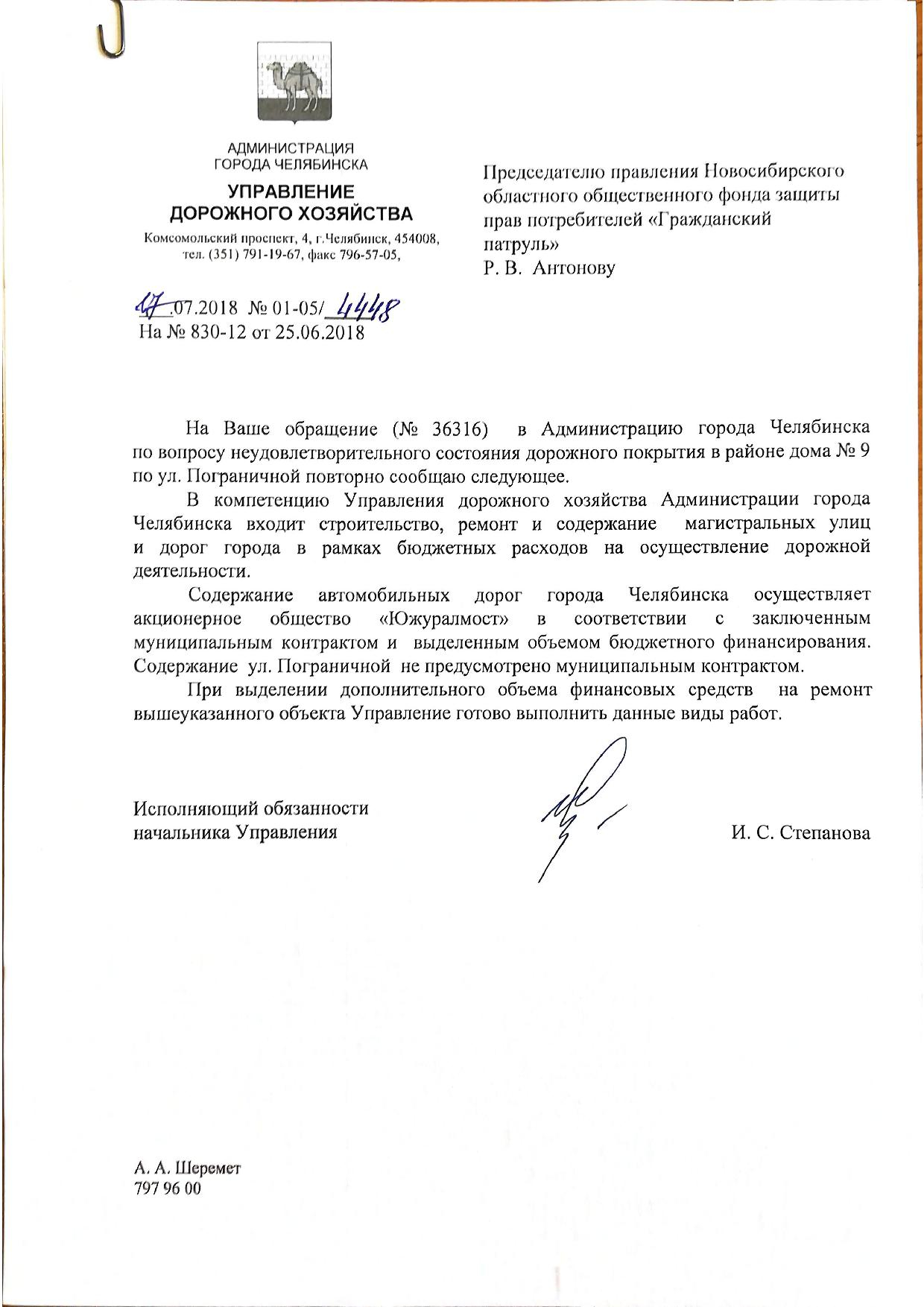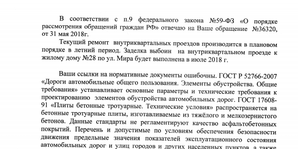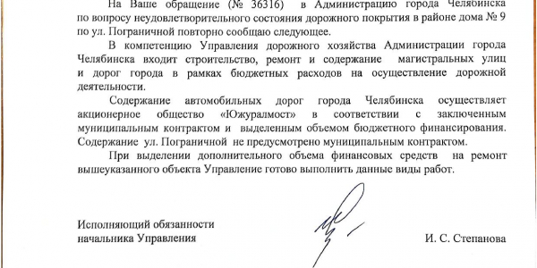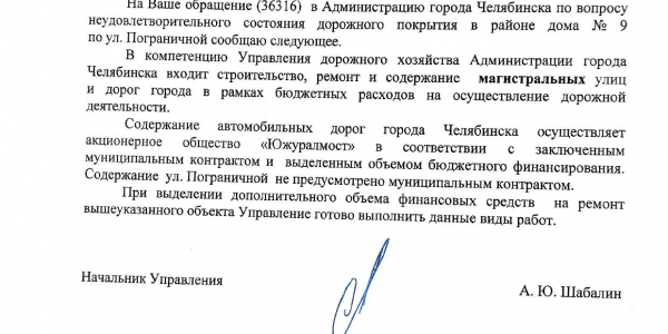 Номер жалобы:36316 Тип жалобы:Ямы во дворе Название объекта:Администрация Ленинского Района Регион:Челябинская область Город:Челябинск Адрес:ул. Пограничная, 9 Описание жалобы:В арке между домами 9 и 10 по улице Пограничной в асфальте многочисленные ямы, что наносит ущерб транспортному средству жителей и гостей данного двора. Просим произвести обновление асфальта на данном участке. Статус: