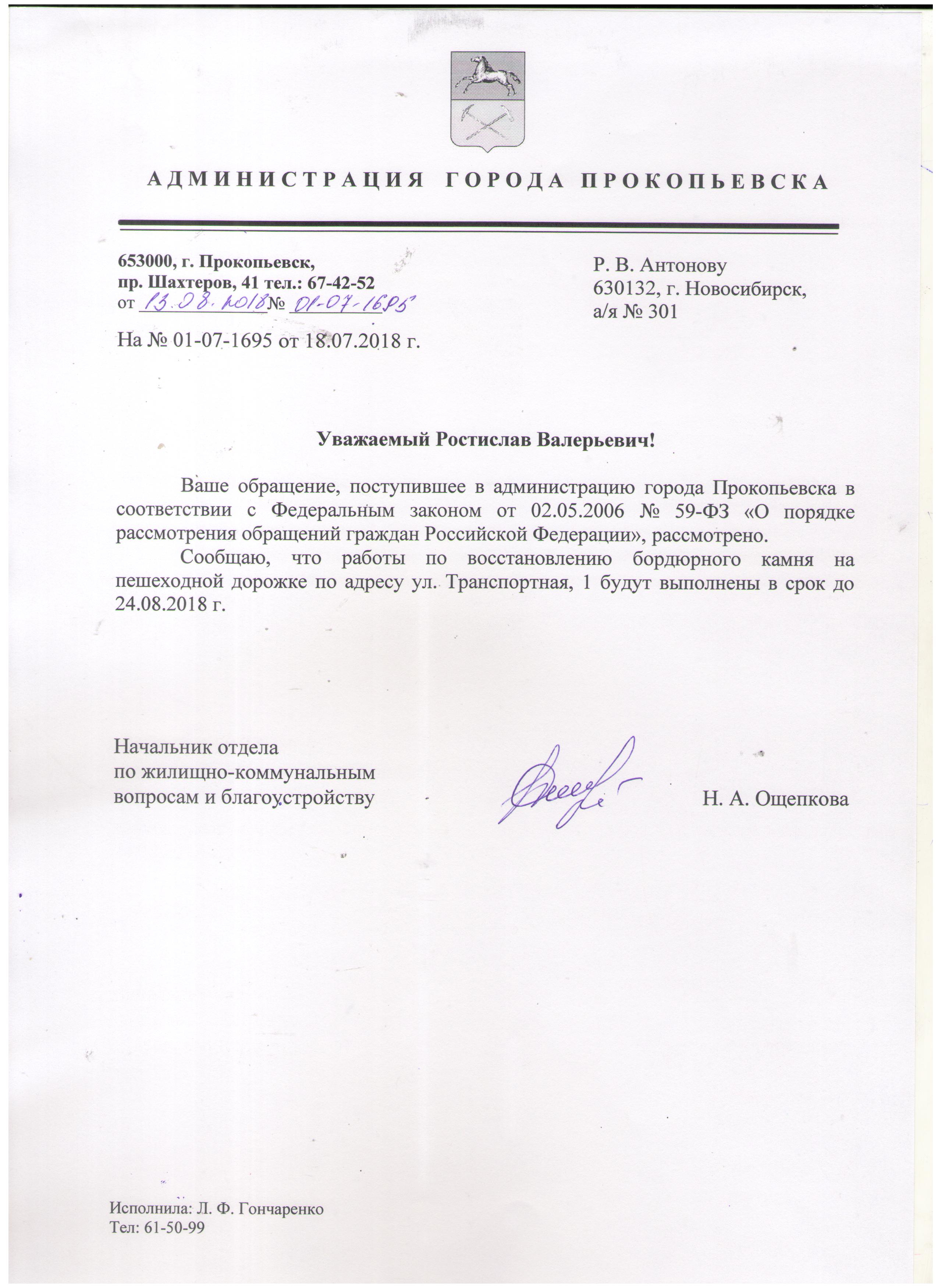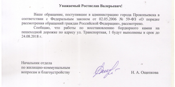 Номер жалобы:38106 Тип жалобы:Прочее Название объекта:7 Регион:Кемеровская область Город:Прокопьевск Адрес:Транспортная ул., 1 Описание жалобы:Бордюрный плита лежит в трове Статус: