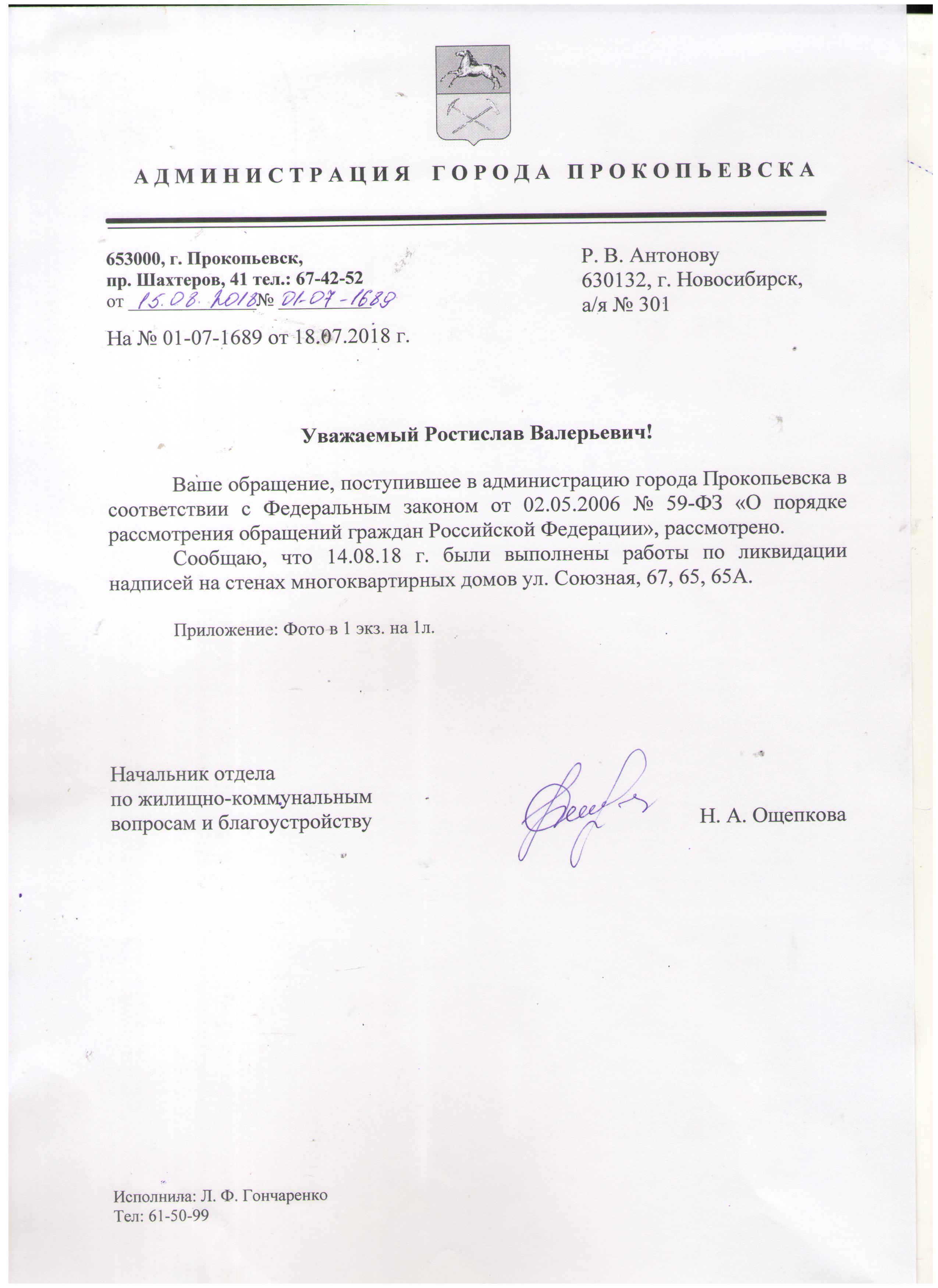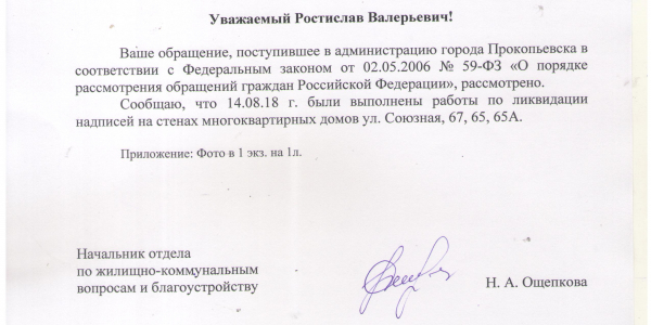 Номер жалобы:38160 Тип жалобы:Прочее Название объекта:7 Регион:Кемеровская область Город:Прокопьевск Адрес:ул. Союзная, 67 Описание жалобы:Надписи о работе на стене. Скорее всего продажа наркотиков. Дом 65 и 65а включительно, так же стоит обследовать ближайшие дома на наличие таких надптсей Статус: