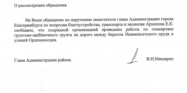 Номер жалобы:38158 Тип жалобы:Прочее Название объекта:Администрация Екатеринбурга Регион:Свердловская область Город:Екатеринбург Адрес:улица Орденоносцев, 4 Описание жалобы:Куча старого асфальта на грунтовой дороге между берегом Нижнеисетского пруда и улицей Ординоносцев. Статус: