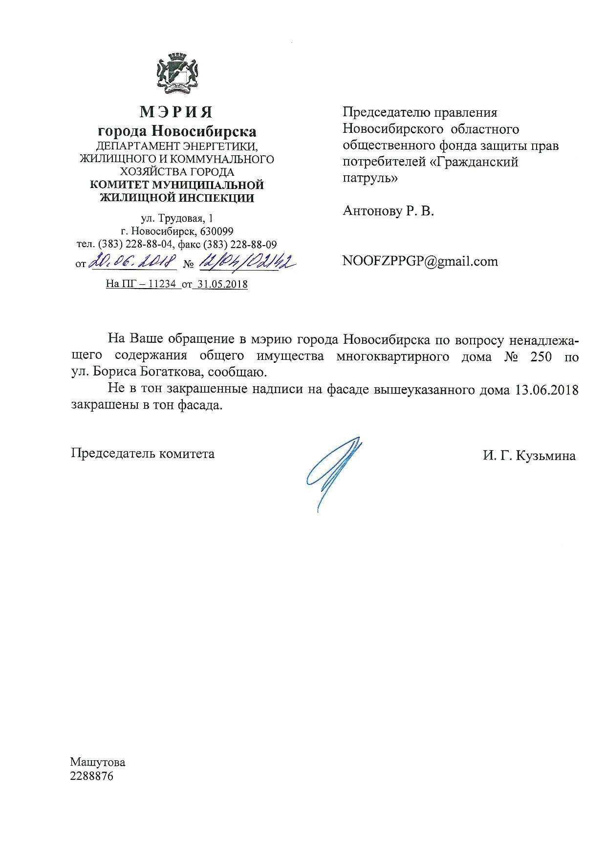 Номер жалобы:35225 Тип жалобы:Иные проблемы ЖКХ Название объекта:Управляющая Компания Регион:Новосибирская область Город:Новосибирск Адрес:ул. Бориса Богаткова, 250 Описание жалобы:Бориса богаткова 250/1,Надписи закрашены не в тон Статус: