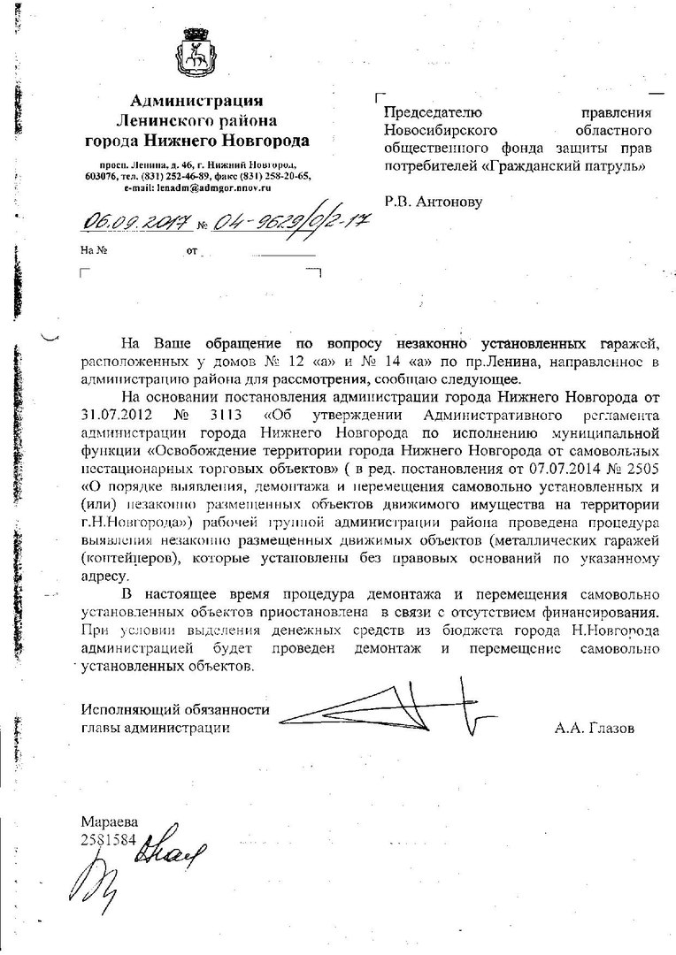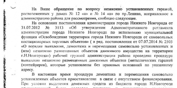 Номер жалобы:37655 Тип жалобы:Прочее Название объекта:Администрация Ленинского района Регион:Нижегородская область Город:Нижний Новгород Адрес:пр. Ленина 12_А Описание жалобы:Продолжается захват территории перед домом. Установили очередной контейнер рядом с газовой магистралью, вырубив кусты. Гаражи тоже стоят незаконно. Статус: