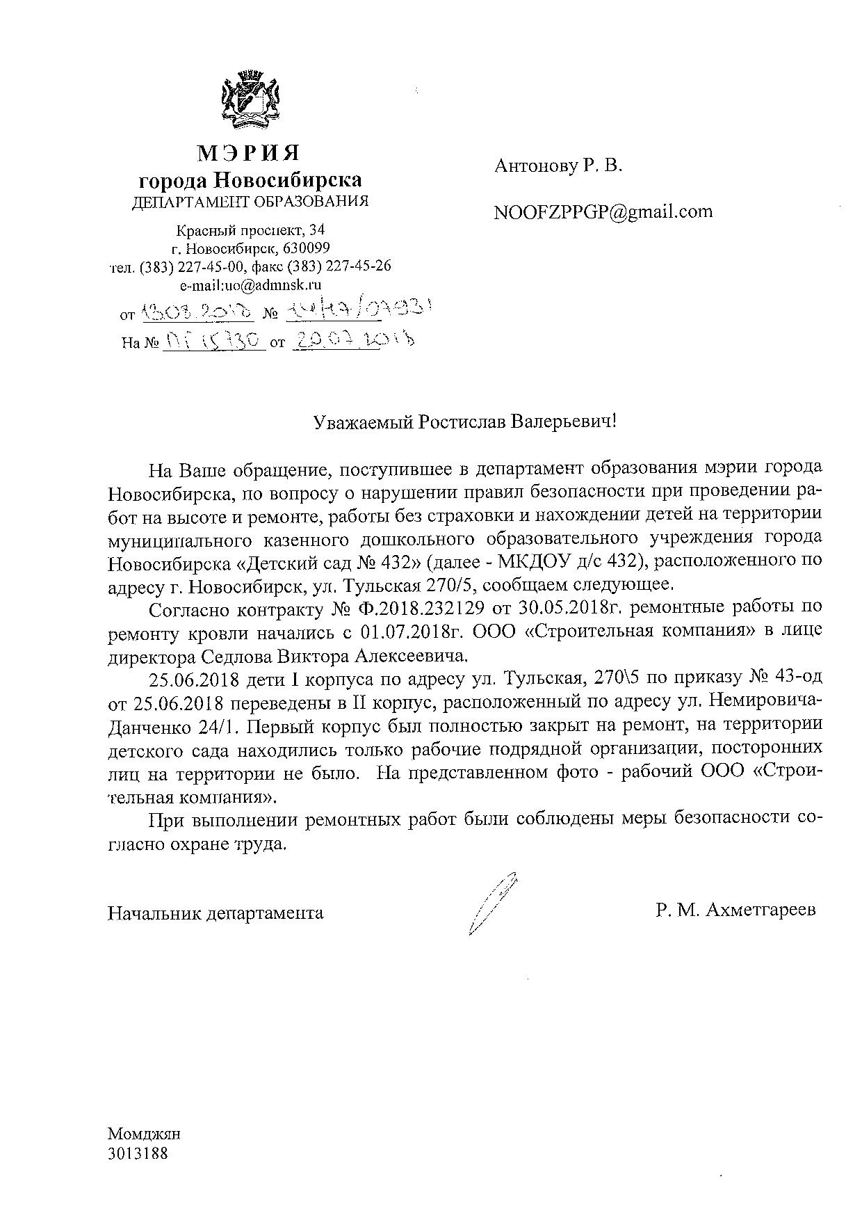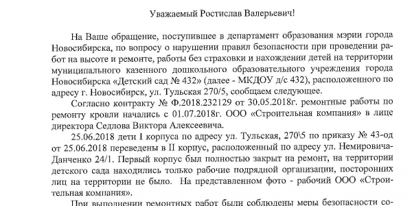 Номер жалобы:37656 Тип жалобы:Прочее Название объекта:Не Установлено Регион:Новосибирская область Город:Новосибирск Адрес:ул. Тульская, 270/5 Описание жалобы:Нарушение правил безопасности при проведении работ на высоте и ремонте. На крыше рабочие без страховки. Внизу дети, а с крыши мусор кидают. Территория детского сада. Место проведения работ не огорожено. Рядом воспитателей нет. На фото, внизу сидит мальчик, на лавочке, а над ним на крыше рабочие кидают остатки кровли. Видимо идёт ремонт. Есть видео Статус: