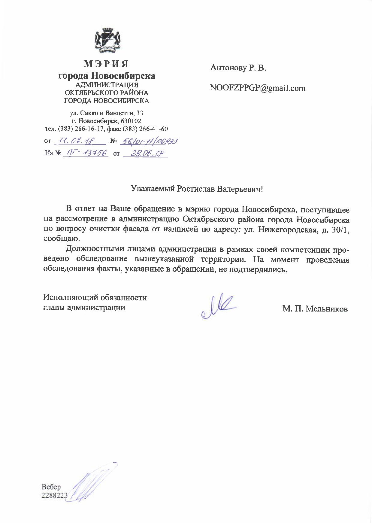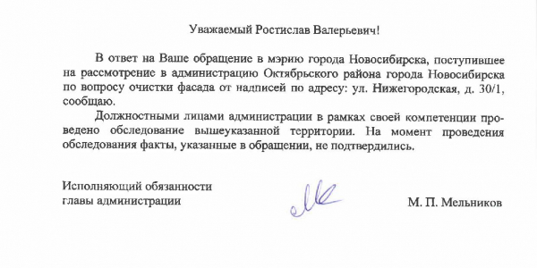 Номер жалобы:37699 Тип жалобы:Прочее Название объекта:Администрация Регион:Новосибирская область Город:Новосибирск Адрес:ул. Нижегородская, 30/1 Описание жалобы:Надписи на фасаде магазина Статус: