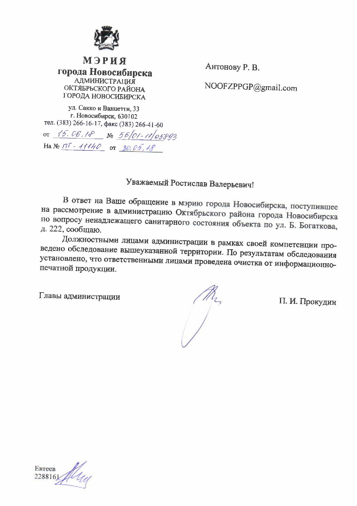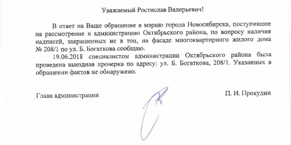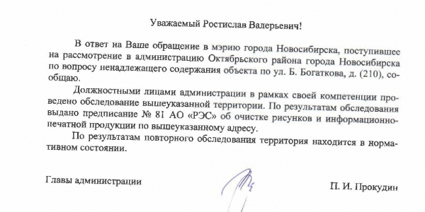 Номер жалобы:35164 Тип жалобы:Иные проблемы ЖКХ Название объекта:Управляющая Компания Регион:Новосибирская область Город:Новосибирск Адрес:ул. Бориса Богаткова, 216 Описание жалобы:Надписи и объявления на хозяйственном корпусе Статус: