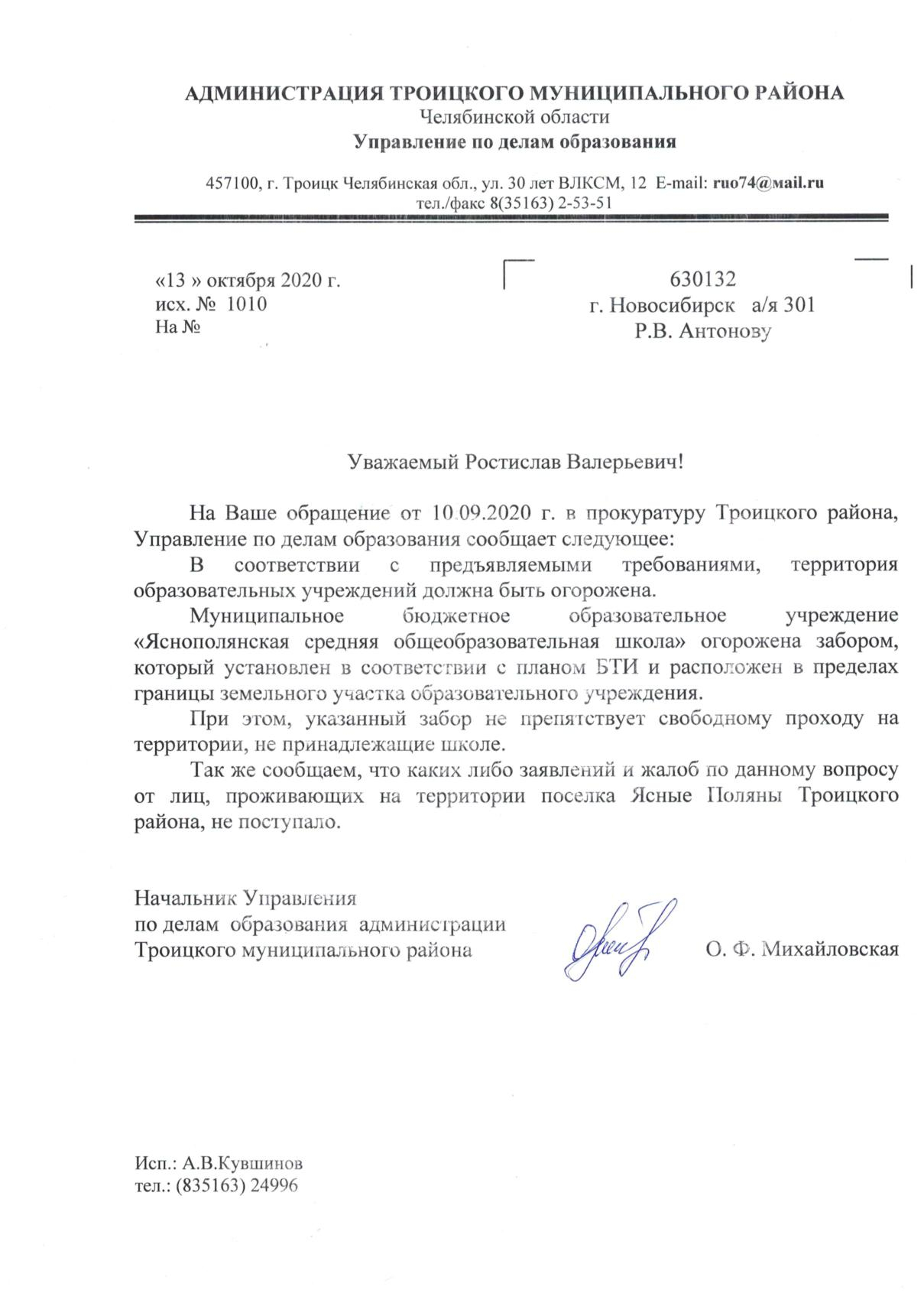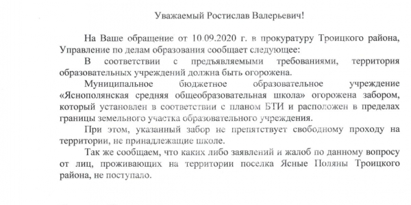 Номер жалобы:68948 Тип жалобы:Прочее Название объекта: Регион:Челябинская область Город:Троицкий район, поселок Ясные Поляны Адрес:Яснополянская Средняя Общеобразовательная школа Описание жалобы:Угловой участок забора препятствует свободному проходу на земли не принадлежащие школе. Согласно кадастровой карте здесь открытый проход. Требуем беспрепятственного прохода и перенос забора в действующие границы образовательного учреждения.