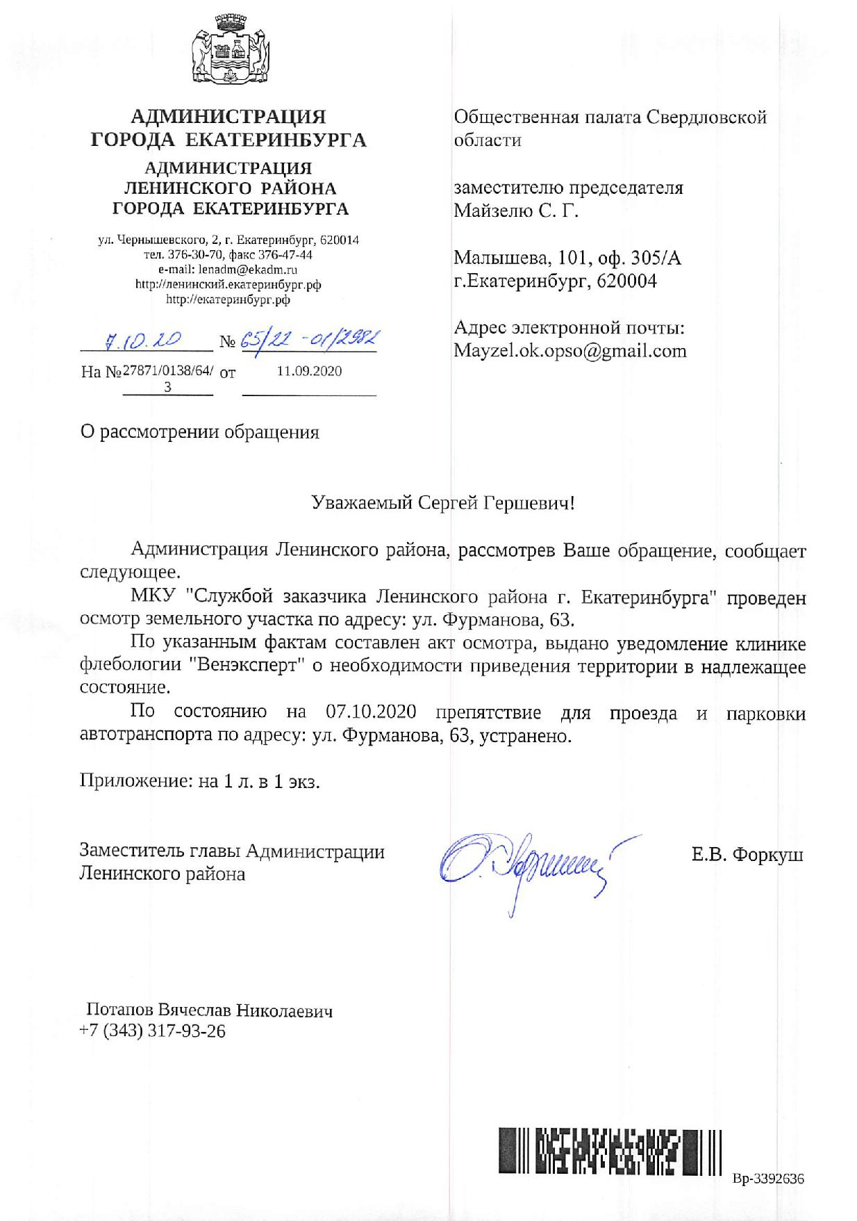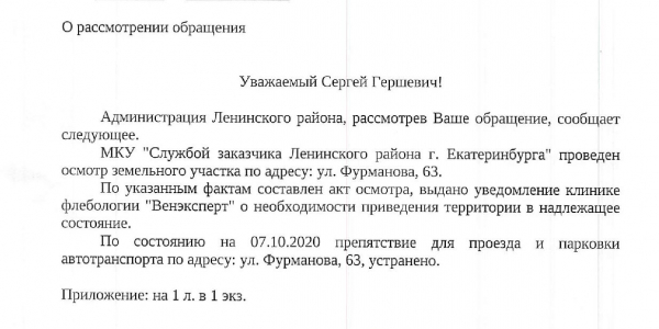 Номер жалобы:68970 Тип жалобы:Прочее Название объекта: Регион:Свердловская область Город:Екатеринбург Адрес:улица Фурманова, 63 Описание жалобы:Около мед центра на Фурманова организована Парковка для клиентов. Часть парковки находится на муниципальной земле. Прошу проверить законность ограничений. В случае нарушения, прошу демонтировать ограничительные элементы. Статус: