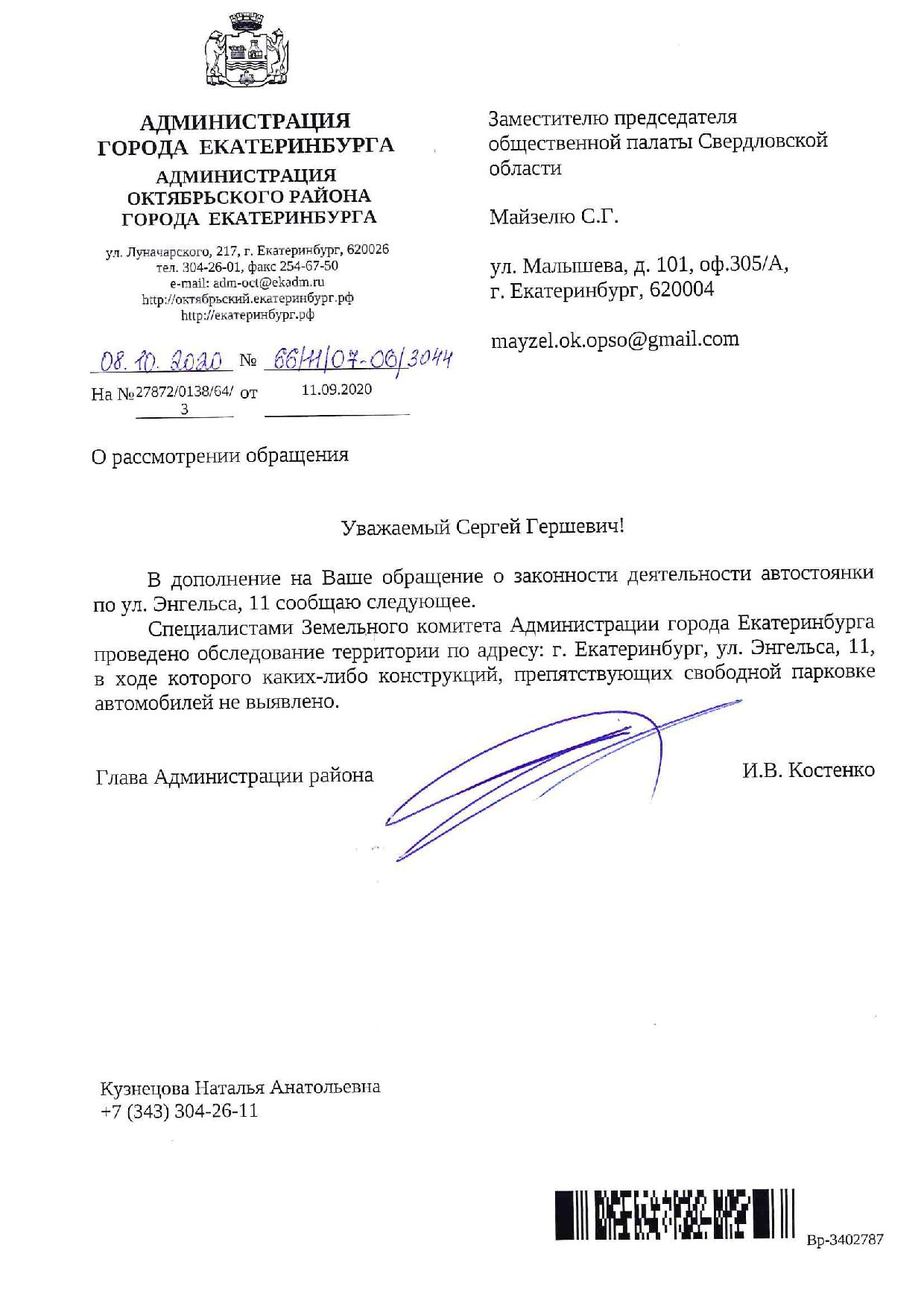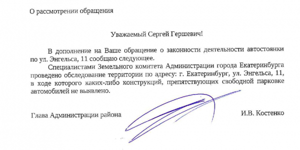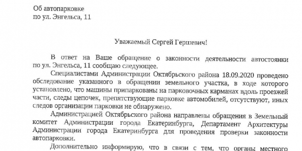 Номер жалобы:68972 Тип жалобы:Прочее Название объекта: Регион:Свердловская область Город:Екатеринбург Адрес:улица Энгельса, 11 Описание жалобы:Около Энгельса 11 организованна парковка. Доступ к парковке перекрывают цепью на столбиках. Парковка находится на муниципальной земле. Прошу проверить законность ограничений. В случае нарушения прошу демонтировать ограничивающие элементы. В том числе столбики. Статус:
