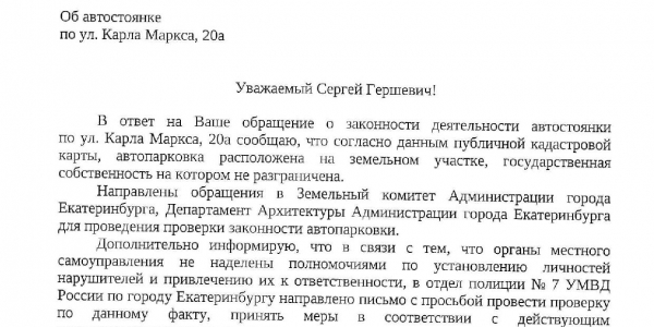 Номер жалобы:68971 Тип жалобы:Прочее Название объекта: Регион:Свердловская область Город:Екатеринбург Адрес:улица Карла Маркса, 20А Описание жалобы:Около Карла Маркса 20а Магазин Светло-Темное организованна закрытая парковка. Часть парковки находится на муниципальной земле. Машины стоят так, что мешают проходу пешеходов . Прошу проверить законность установки ограничительных элементов. В случае нарушения прошу демонтировать их. Статус:
