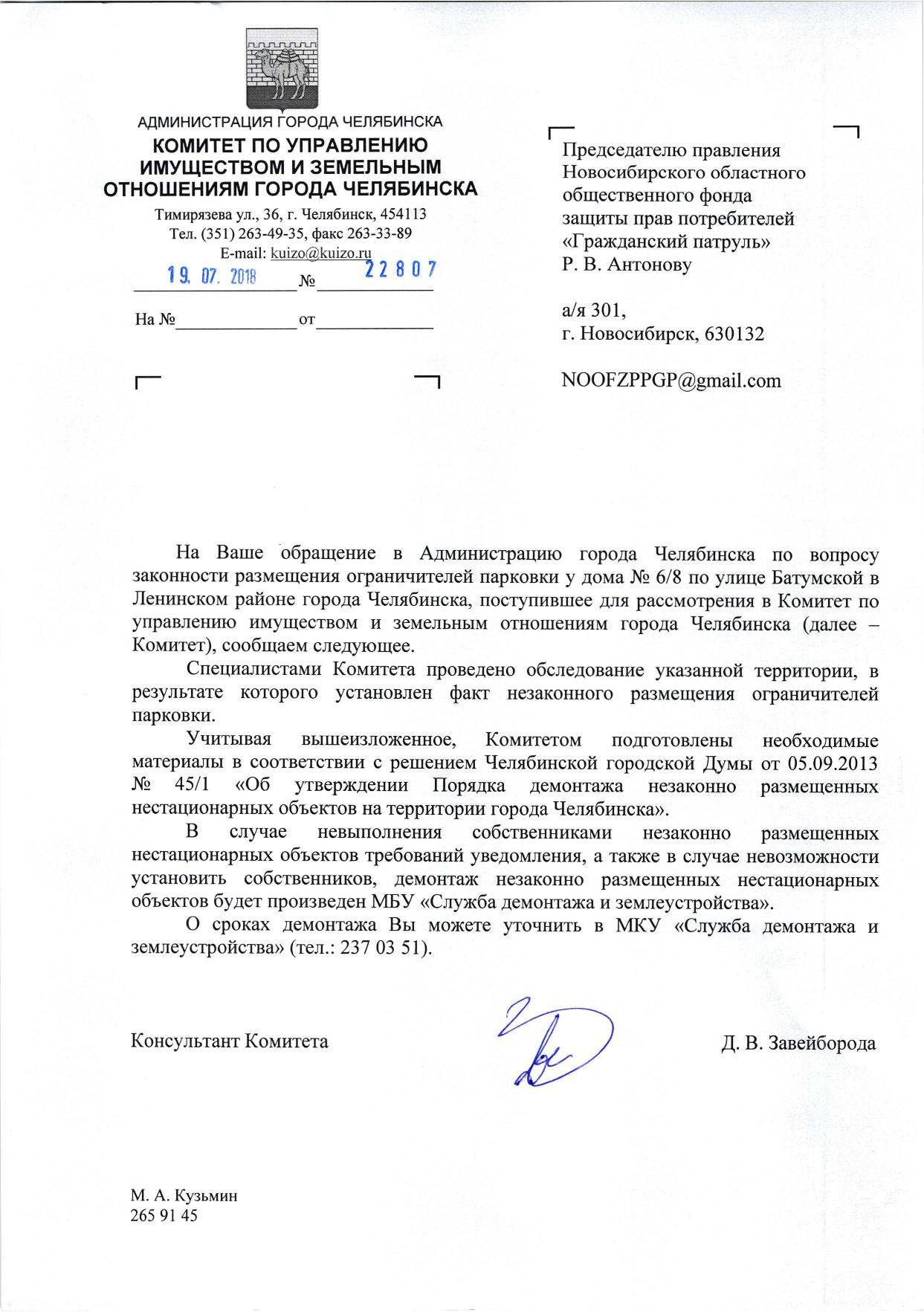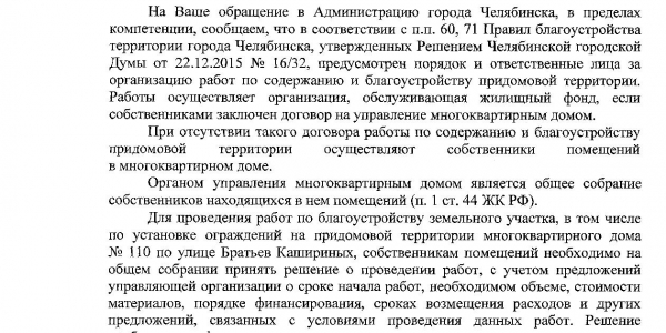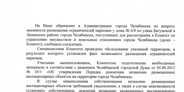 Номер жалобы:37253 Тип жалобы:Прочее Название объекта:Жкх Регион:Челябинская область Город:Челябинск Адрес:ул. Батумская, 6/8 Описание жалобы:Незаконная установка заграждений препятствующих проезду спец транспорта Статус: