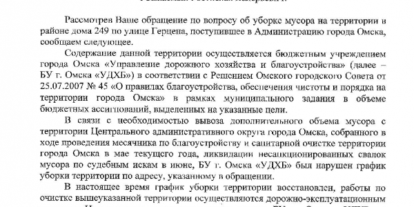Номер жалобы:37245 Тип жалобы:Прочее Название объекта:Не Установлено Регион:Алтайский край Город:Барнаул Адрес:ул. Матросова, 210 Описание жалобы:Не организованный сбор мусора, стоит ванна посреди улицы, бросают мусор в неё. Не ясно, кому принадлежит, вывозят мусор или нет, нет крышки, как у нормальных баков на мусоросборнике, собаки и птицы таскают пакеты. Словно гетто, а не жилая улица. Необходимо убрать это безобразие и организовать нормальный сбор тбо и прочее. Статус: