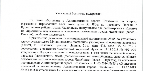 Номер жалобы:37230 Тип жалобы:Прочее Название объекта:ГИБДД Регион:Челябинская область Город:Челябинск Адрес:просп. Победы, 380А Описание жалобы:Проверить парковку на законностью Статус: