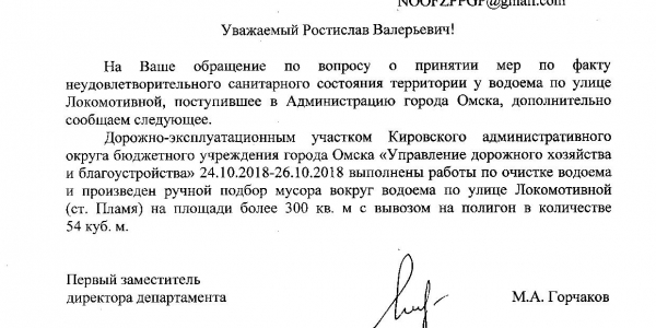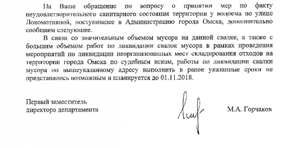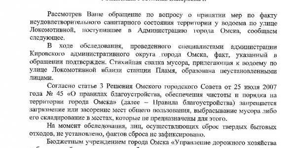 Номер жалобы:37248 Тип жалобы:Прочее Название объекта:Мэрия Регион:Омская область Город:Омск Адрес:ул. Локомотивная, Описание жалобы:Несанкционированная свалка мусора, загрязнение водоема Статус: