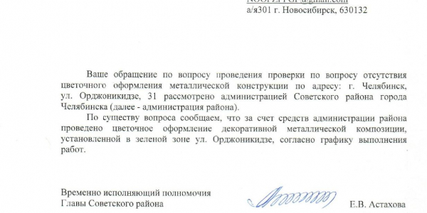 Номер жалобы:37255 Тип жалобы:Прочее Название объекта:Администрация Советского Района Регион:Челябинская область Город:Челябинск Адрес:ул. Орджоникидзе, 31 Описание жалобы:Почему в центре города конструкции под цветы стоят пустые? Это усугубляет впечатление запущения района. Кроме того, эти конструкции были сооружены с конкретной целью и стоили денег. Мы, жильцы района, против того, чтобы они стояли заброшенными. Статус: