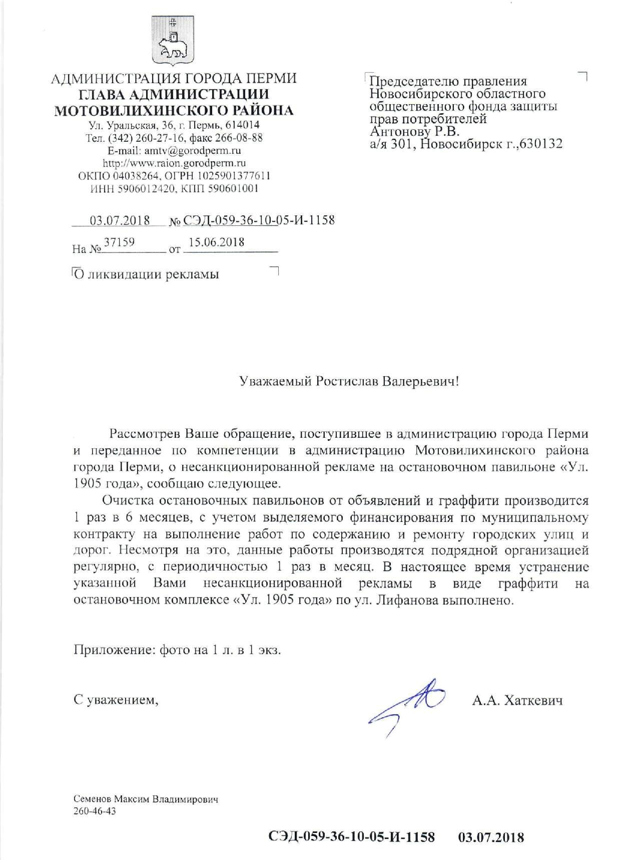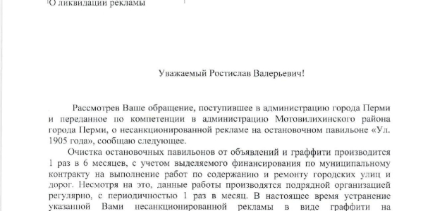 Номер жалобы:37159 Тип жалобы:Прочее Название объекта:Администрация Регион:Пермский край Город:Пермь Адрес:ул. Славянова, 19 Описание жалобы:Реклама такси на остановке 1905г. В сторону города Статус: