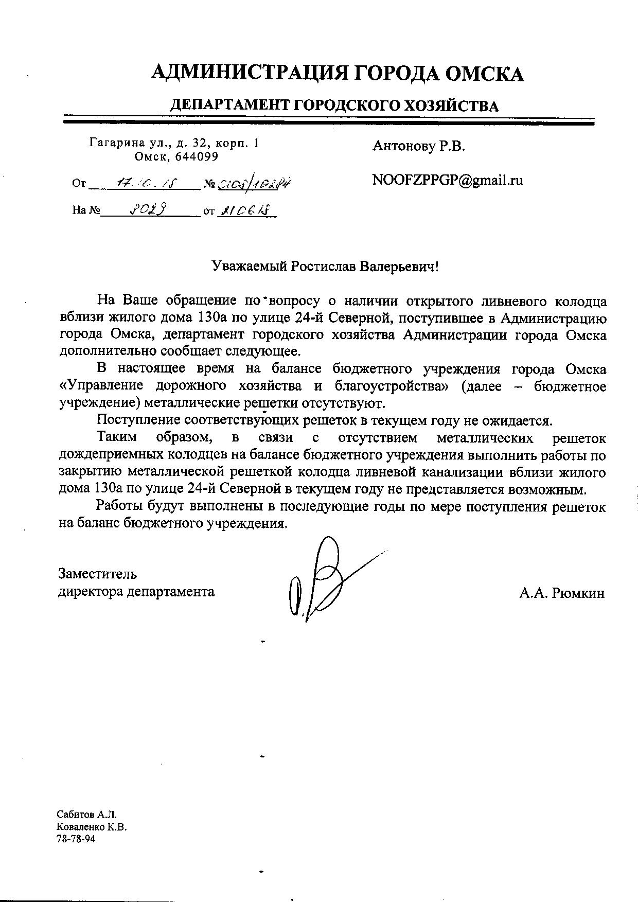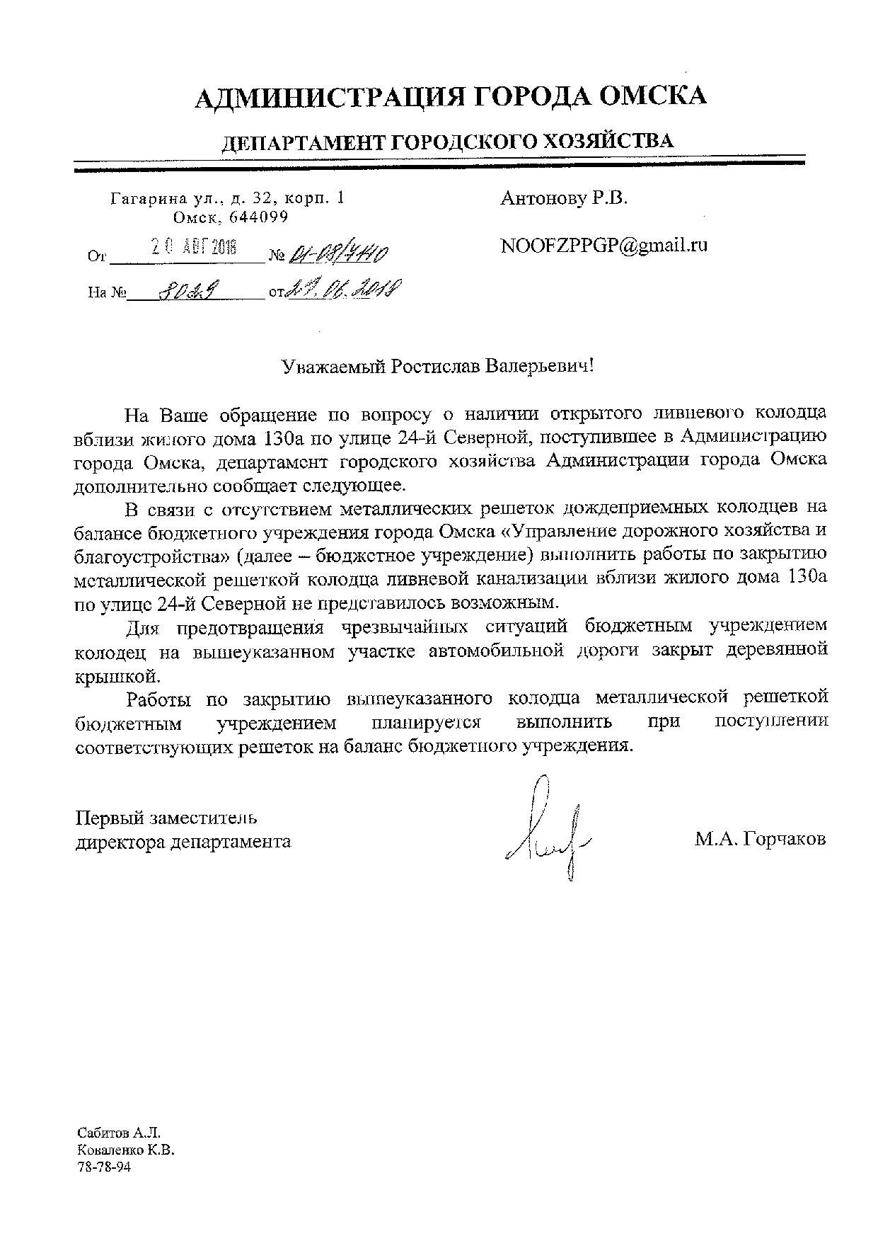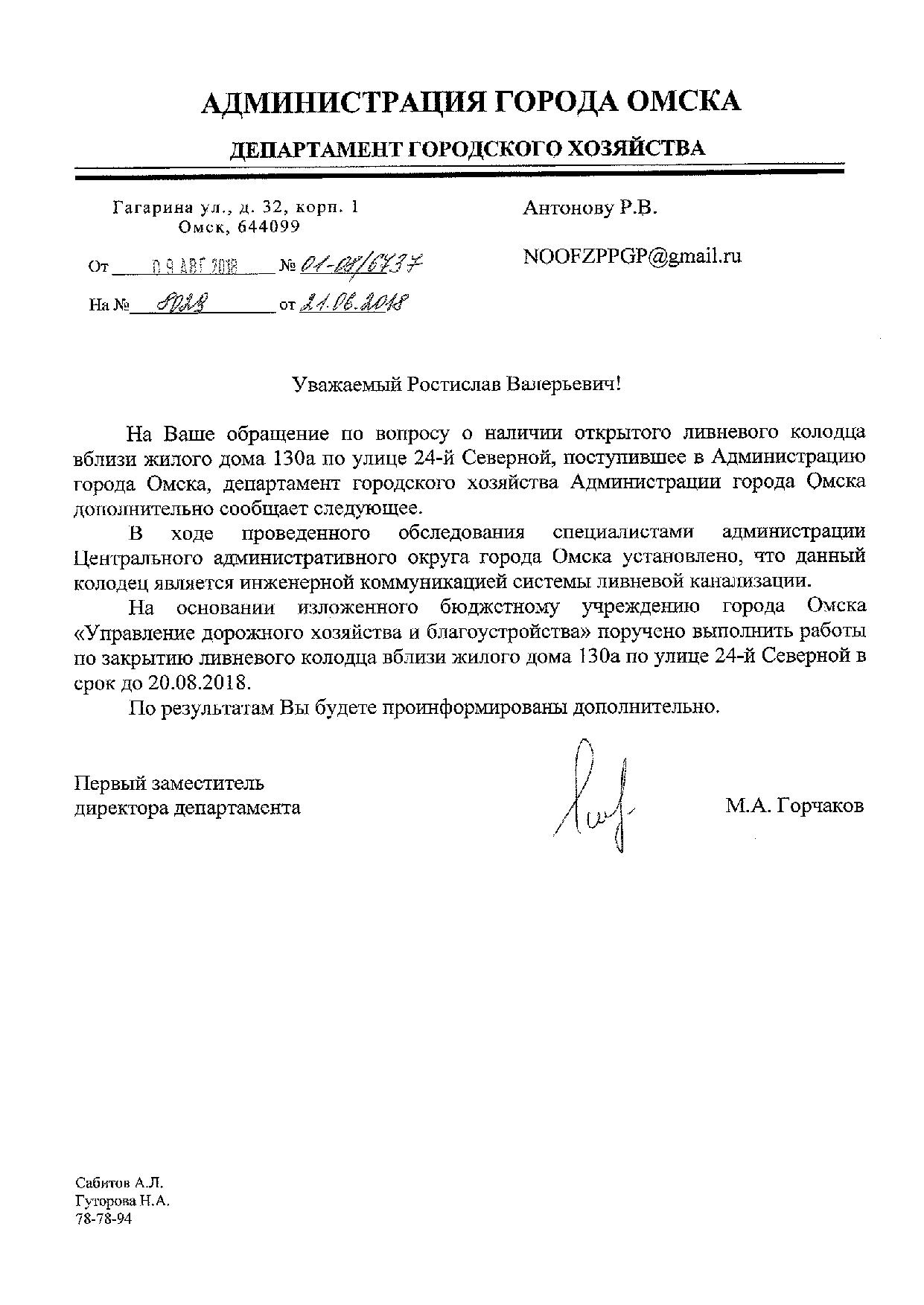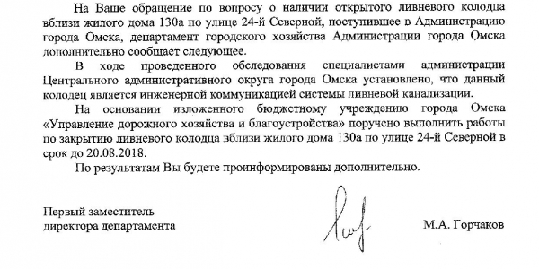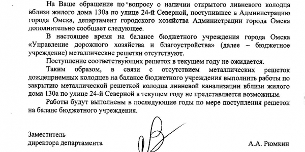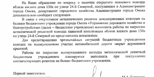Номер жалобы:37195 Тип жалобы:Прочее Название объекта:Мэрия Регион:Омская область Город:Омск Адрес:ул. 24-я Северная, 130А Описание жалобы:Открытая ливневка Статус:
