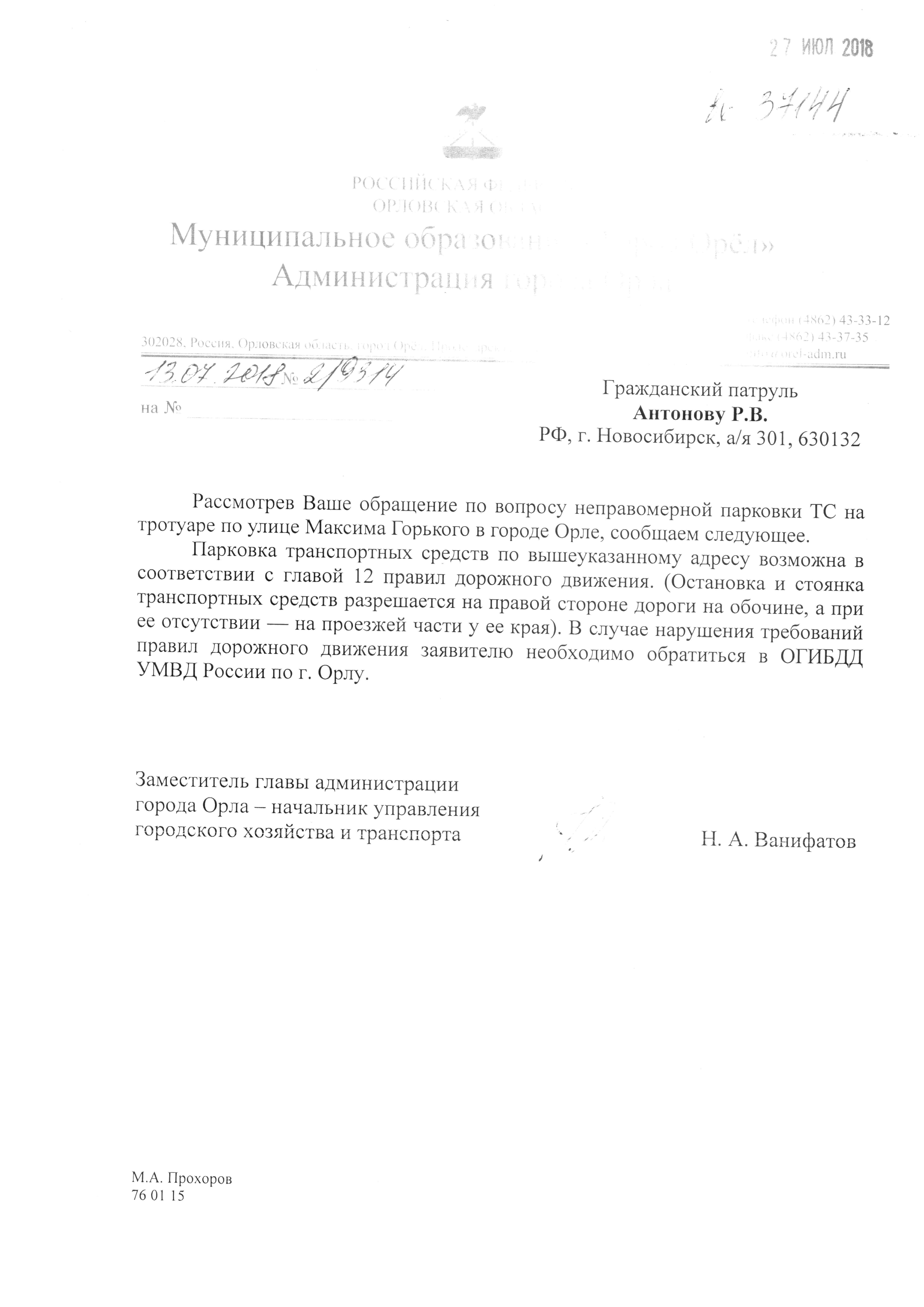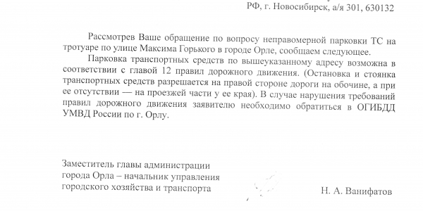 Номер жалобы:37153 Тип жалобы:Прочее Название объекта:УГИБДД Орловской Области Город:Орёл Адрес:Орёл, Каменская площадь, 1 Описание жалобы:Нарушение ПДД движение, остановка и стоянка на тротуаре Статус:
