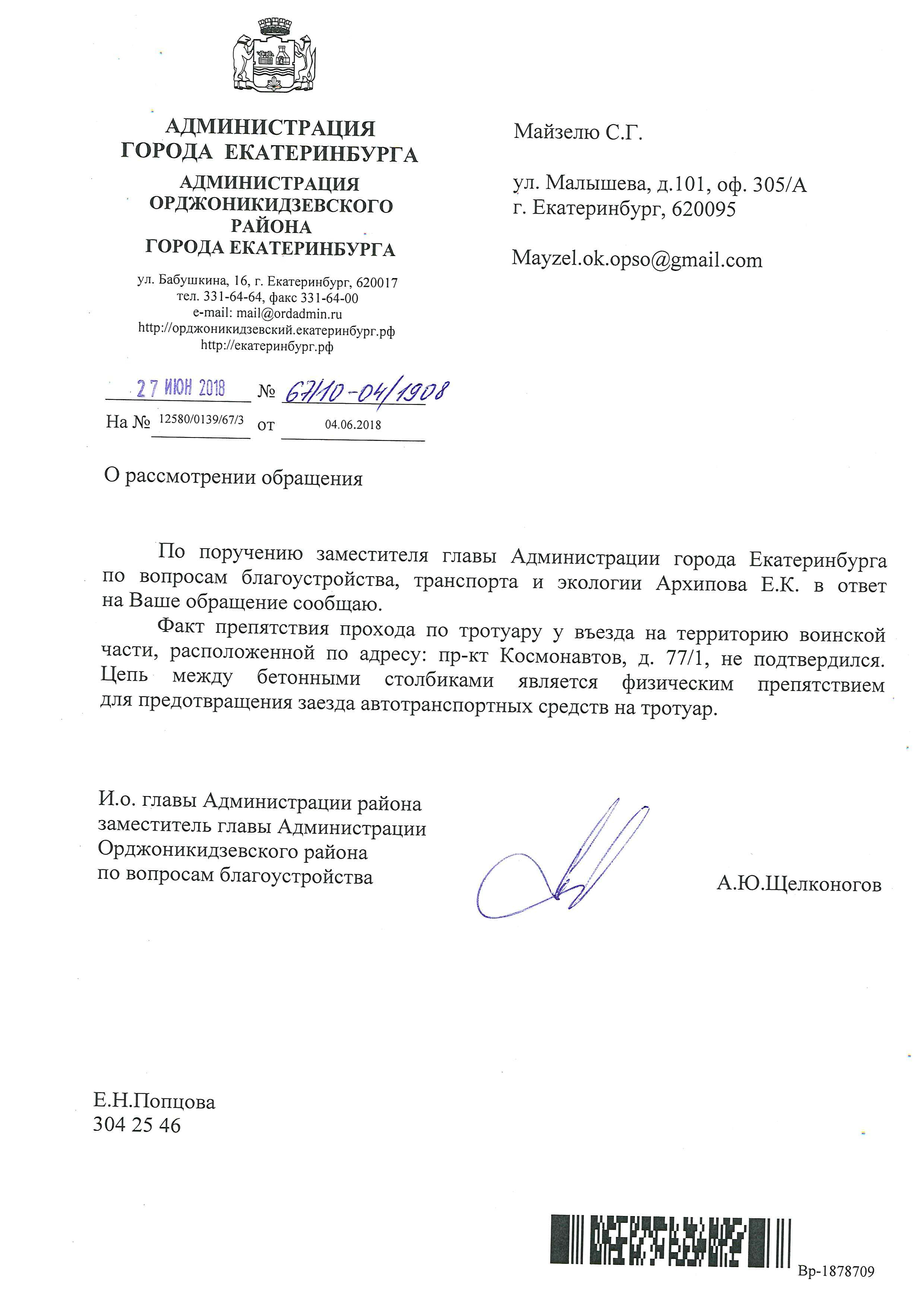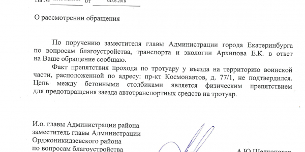 Номер жалобы:36730 Тип жалобы:Прочее Название объекта:Администрация Екатеринбурга Регион:Свердловская область Город:Екатеринбург Адрес:улица Бакинских Комиссаров, 173 Описание жалобы:Цепь вдоль въезда на территорию воинской части препятствует проходу по тротуару вдоль нечётной стороны Космонавтов. Статус: