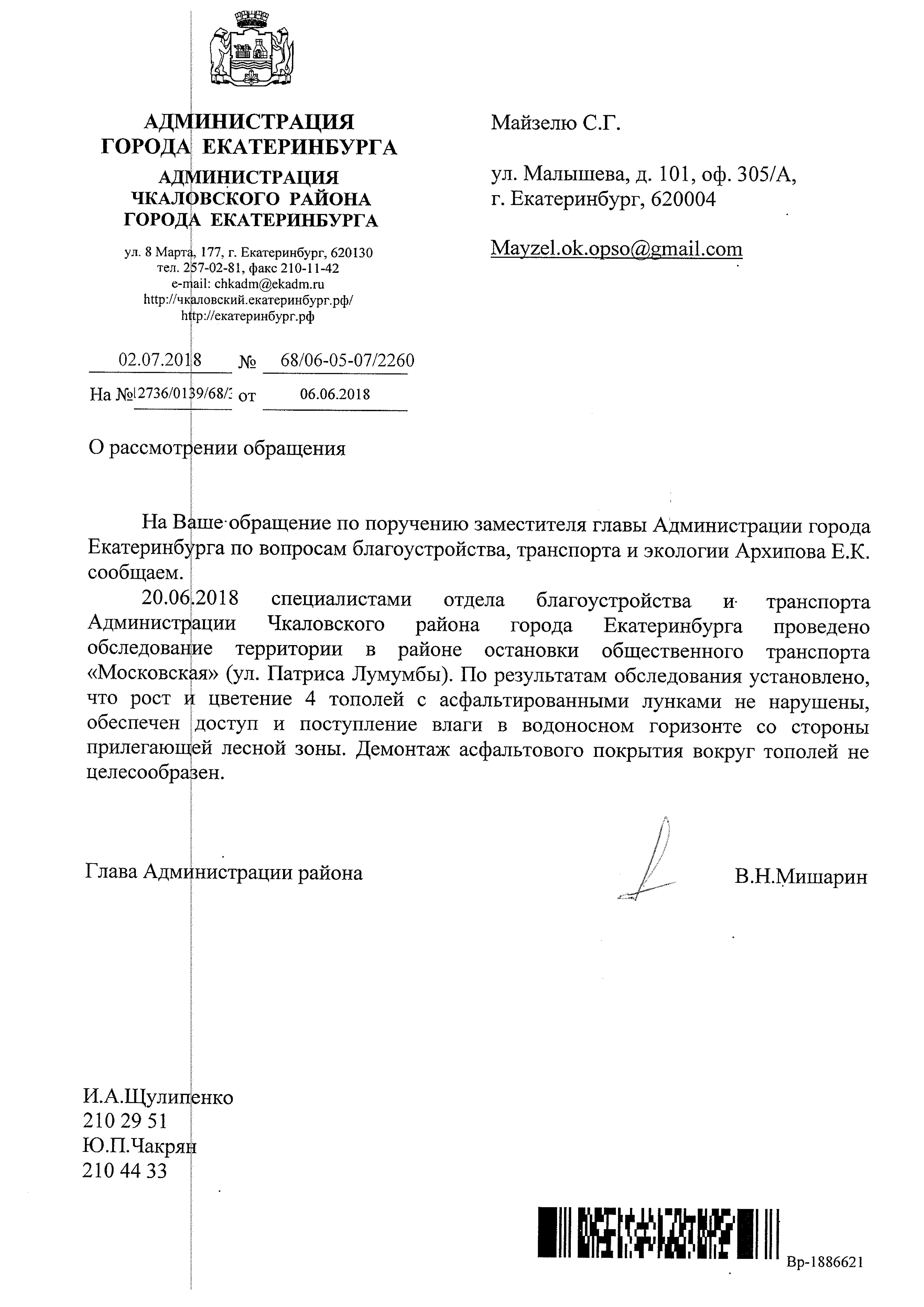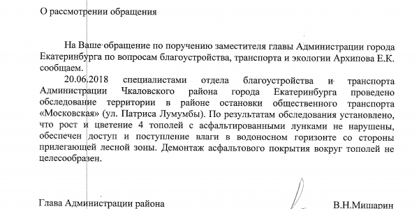 Номер жалобы:36786 Тип жалобы:Прочее Название объекта:Администрация Екатеринбурга Регион:Свердловская область Город:Екатеринбург Адрес:ост. Московская (ул. Патриса Лумумбы) Описание жалобы:Заасфальтированы приствольные лунки у четырёх тополей, растущих на автобусной остановке «Московская» в направлении остановки «Дорожная». Статус:
