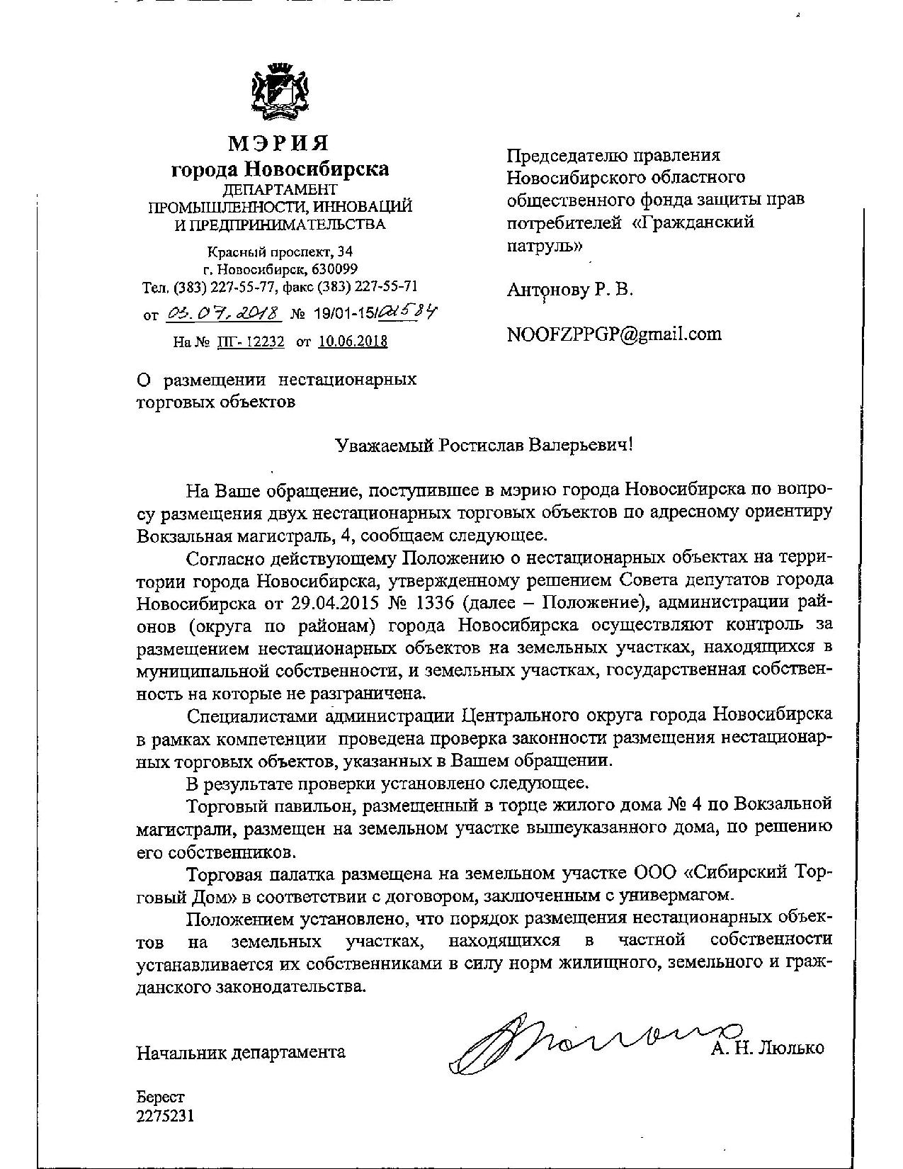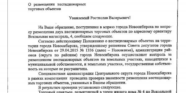 Номер жалобы:36852 Тип жалобы:Прочее Название объекта: Город:г. Новосибсирк Адрес:ул. Вокзальная магистраль, 4 Описание жалобы:Просьба проверить законность 2ух киосков.