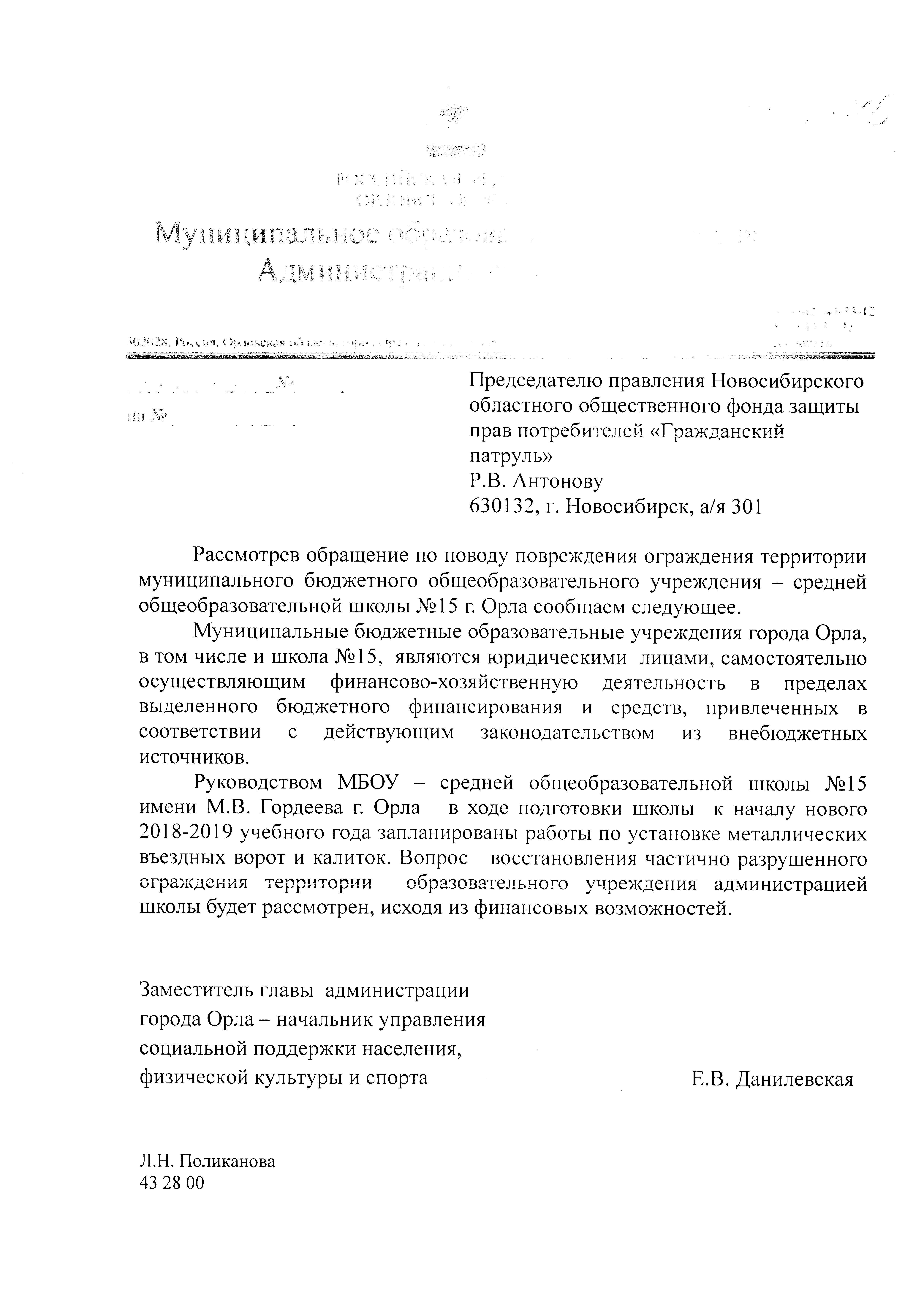 Номер жалобы:36874 Тип жалобы:Прочее Название объекта:Администрация Города Орла Город:Орёл Адрес:Орёл, улица Генерала Родина, 14 Описание жалобы:Ограждение 15 школы местами сильно повреждено или отсутствует, что угрожает безопасности детей и посетителей, персонала Статус: