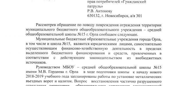 Номер жалобы:36873 Тип жалобы:Прочее Название объекта:Прокуратура Орловской Области Город:Орёл Адрес:Орёл, улица Генерала Родина, 14 Описание жалобы:Ограждение 15 школы местами сильно повреждено или отсутствует, что угрожает безопасности детей и посетителей, персонала Статус: