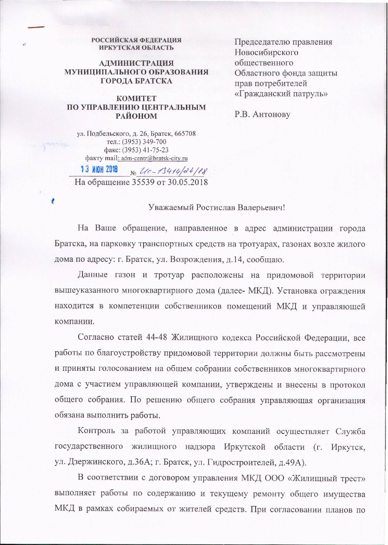 Номер жалобы:35780 Тип жалобы:Прочее Название объекта:Адм Регион:Иркутская область Город:Братск Адрес:ул. Подбельского, 42 Описание жалобы:Использование активистами организации НОД городских конструкций для размещения агитации. Предположительно, несогласованное использование имущества города. 18.05.2018 8:50 Статус: