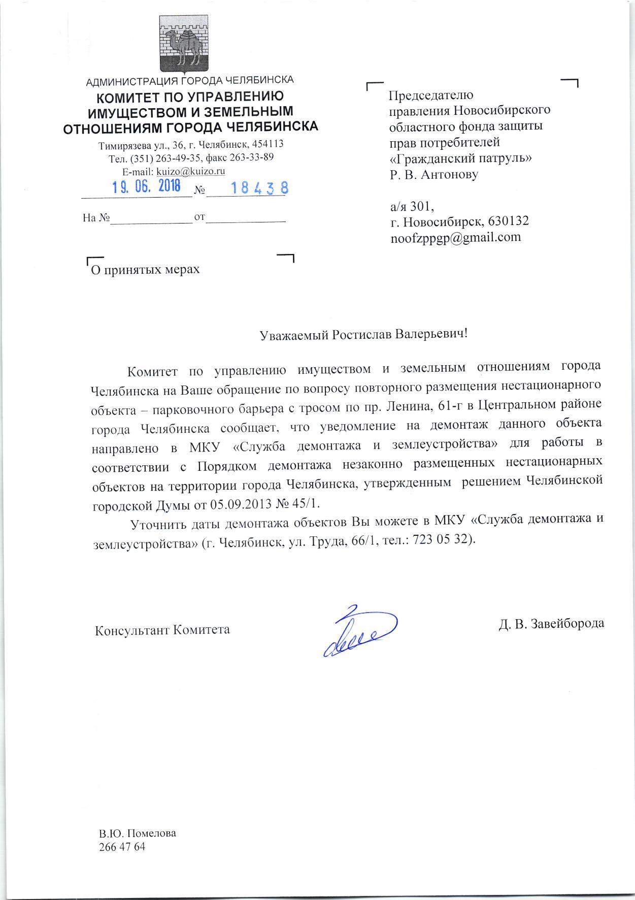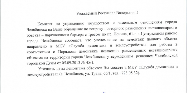 Номер жалобы:35850 Тип жалобы:Прочее Название объекта:Огороженная Парковка Регион:Челябинская область Город:Челябинск Адрес:пр. Ленина, 61А Описание жалобы:После демонтажа незаконной парковки во дворе жилого дома по адресу Челябинск,пр.Ленина, 61, через неделю её вновь отгородили тросом и антипарковочным барьером. Прошу найти причастных и привлечь к ответственности за самозахват дворовой территории. (Начать поиски можно с руководства турагентства Спутник). Статус: