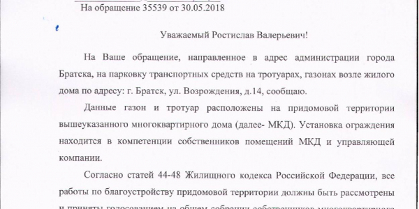 Номер жалобы:35539 Тип жалобы:Прочее Название объекта:ГИБДД Регион:Иркутская область Город:Братск Адрес:ул. Возрождения, 14 Описание жалобы:Парковка на газоне, выхлопы в окно Статус:
