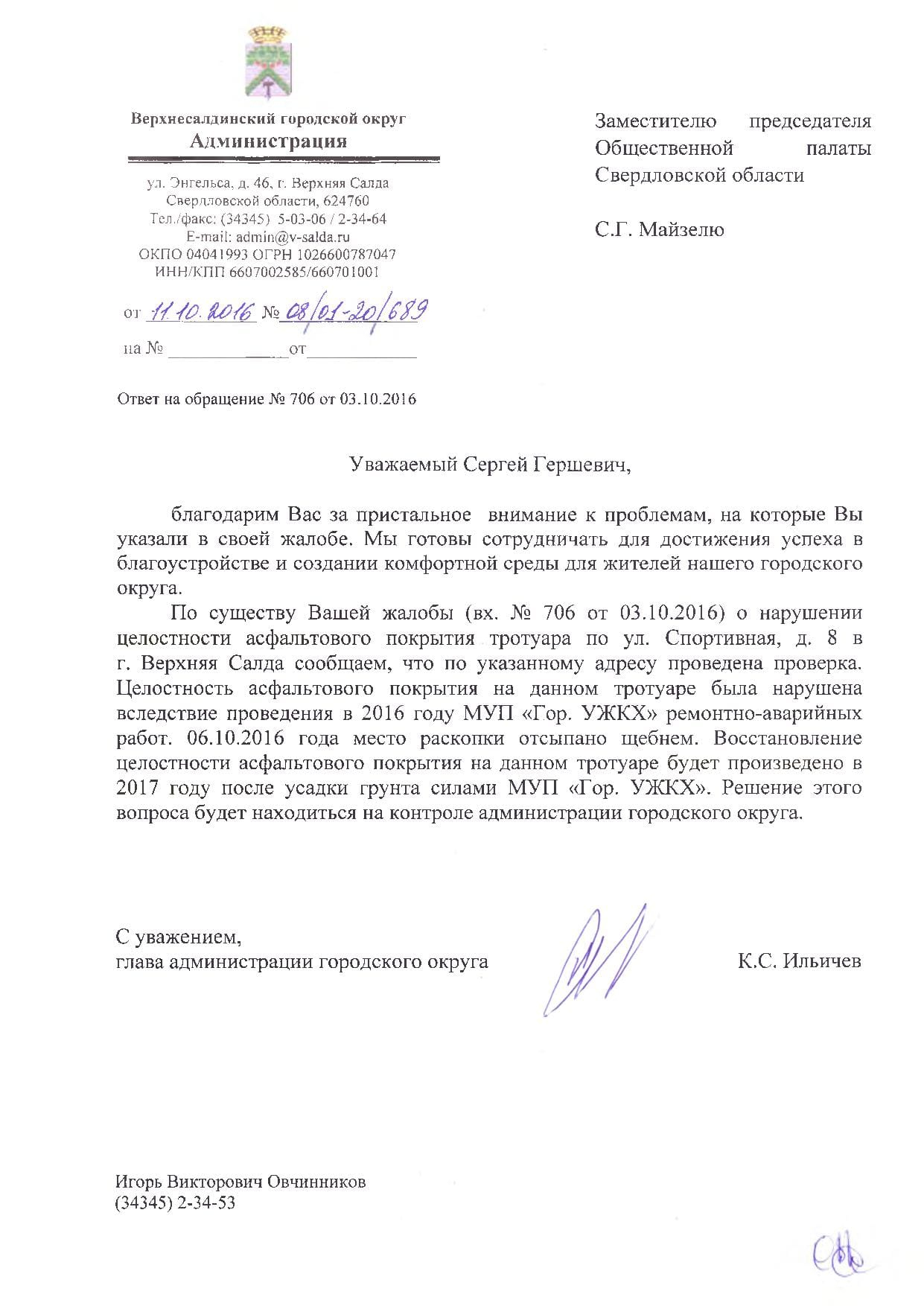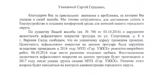 Номер жалобы:9683 Тип жалобы:Ямы на тротуарах Название объекта: Регион:Свердловская область Город:Верхняя Салда Адрес:Спортивная, 8 Описание жалобы:После земляных работ разрушен тротуар. Пешеходы вынуждены передвигаться по грязи. Необходимо отсыпать тротуар мелким щебнем и отсевом Статус: