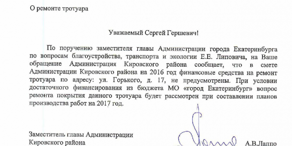 Номер жалобы:9289 Тип жалобы:Ямы на тротуарах Название объекта:Администрация Екатеринбурга Регион:Свердловская область Город:Екатеринбург Адрес:ул. Горького, 17 Описание жалобы:Провал на тротуаре в 20 м к северу от входа в «Экспресс химчистку». Статус: