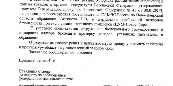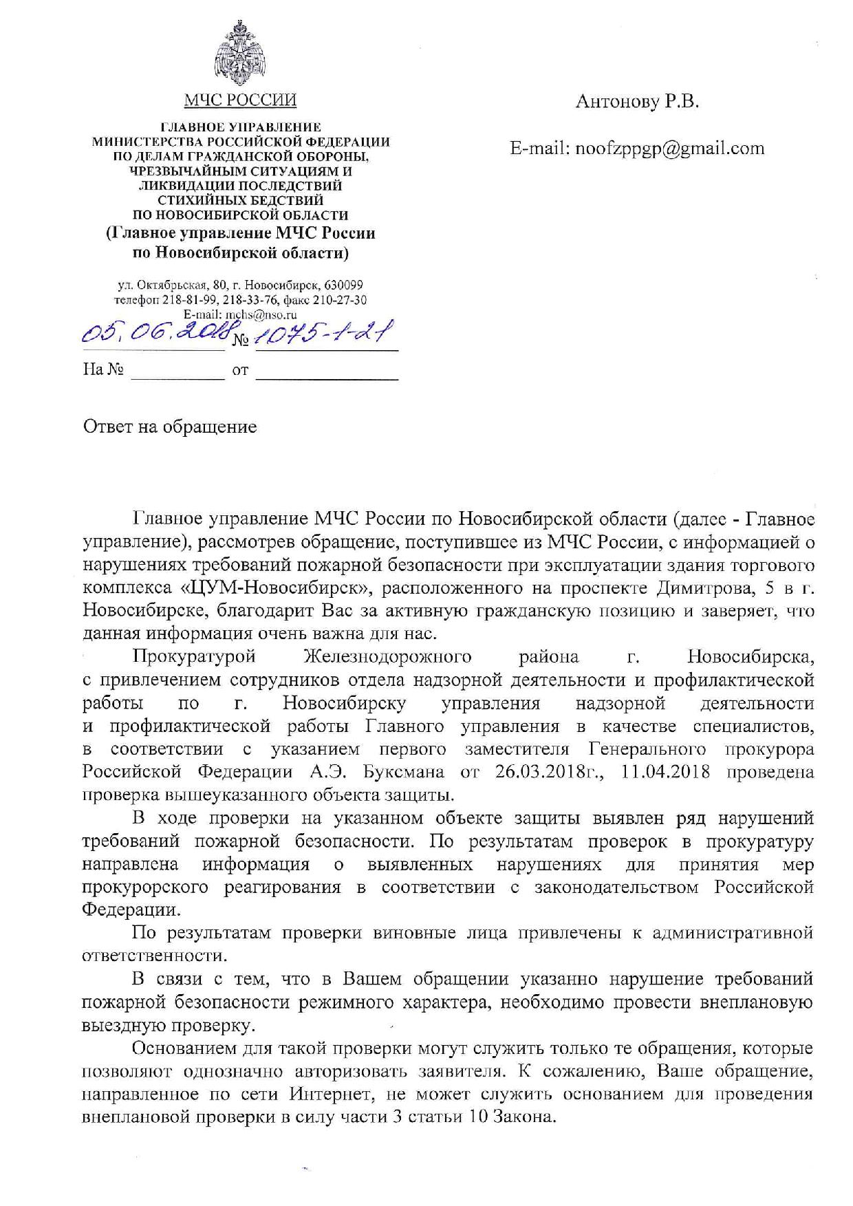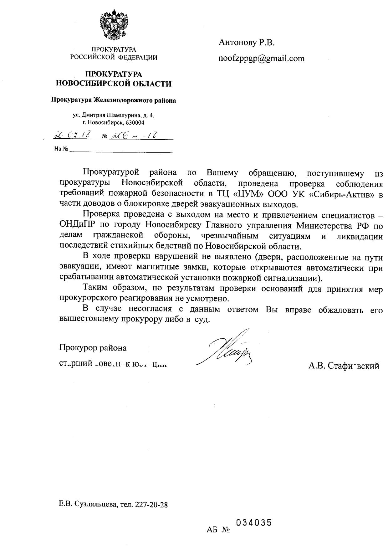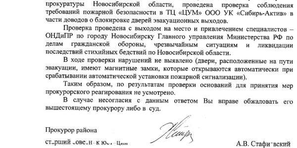 Номер жалобы:34932 Тип жалобы:Прочее Название объекта:Цум Регион:Новосибирская область Город:Новосибирск Адрес:пр. Димитрова, 5 Описание жалобы:Закрыты эвакуационные выходы на 3 этаже Статус: